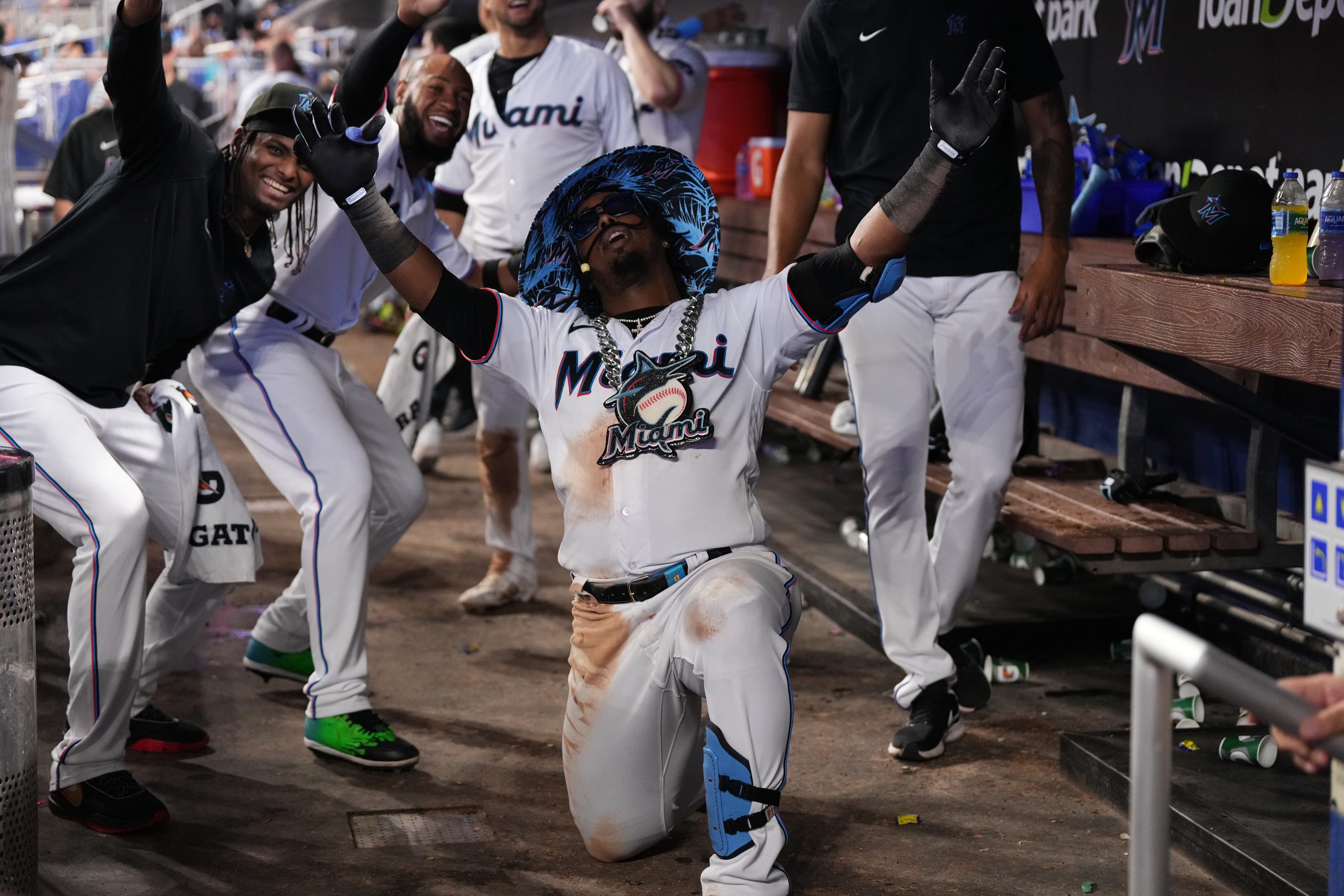 Photo Credit: Jean Segura #9 of the Miami Marlins celebrates with teammates in the dugout after hitting a solo home-run in the game against the Detroit Tigers at loanDepot park on July 30, 2023 in Miami, Florida. (Photo by Jasen Vinlove/Miami Marlins/Getty Images)