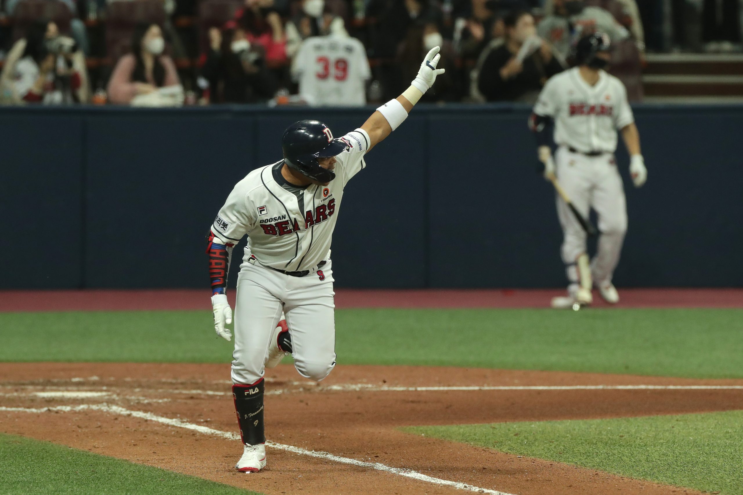 Photo Credit: Infilder Jose Fernandez #9 of Doosan Bears hits two RBI single to make the score 6-3 in the bottom of the sixth inning during the Korean Series Game 4 between Doosan Bears and KT Wiz at Gocheok Skydome on November 18, 2021 in Seoul, South Korea. (Photo by Han Myung-Gu/Getty Images)