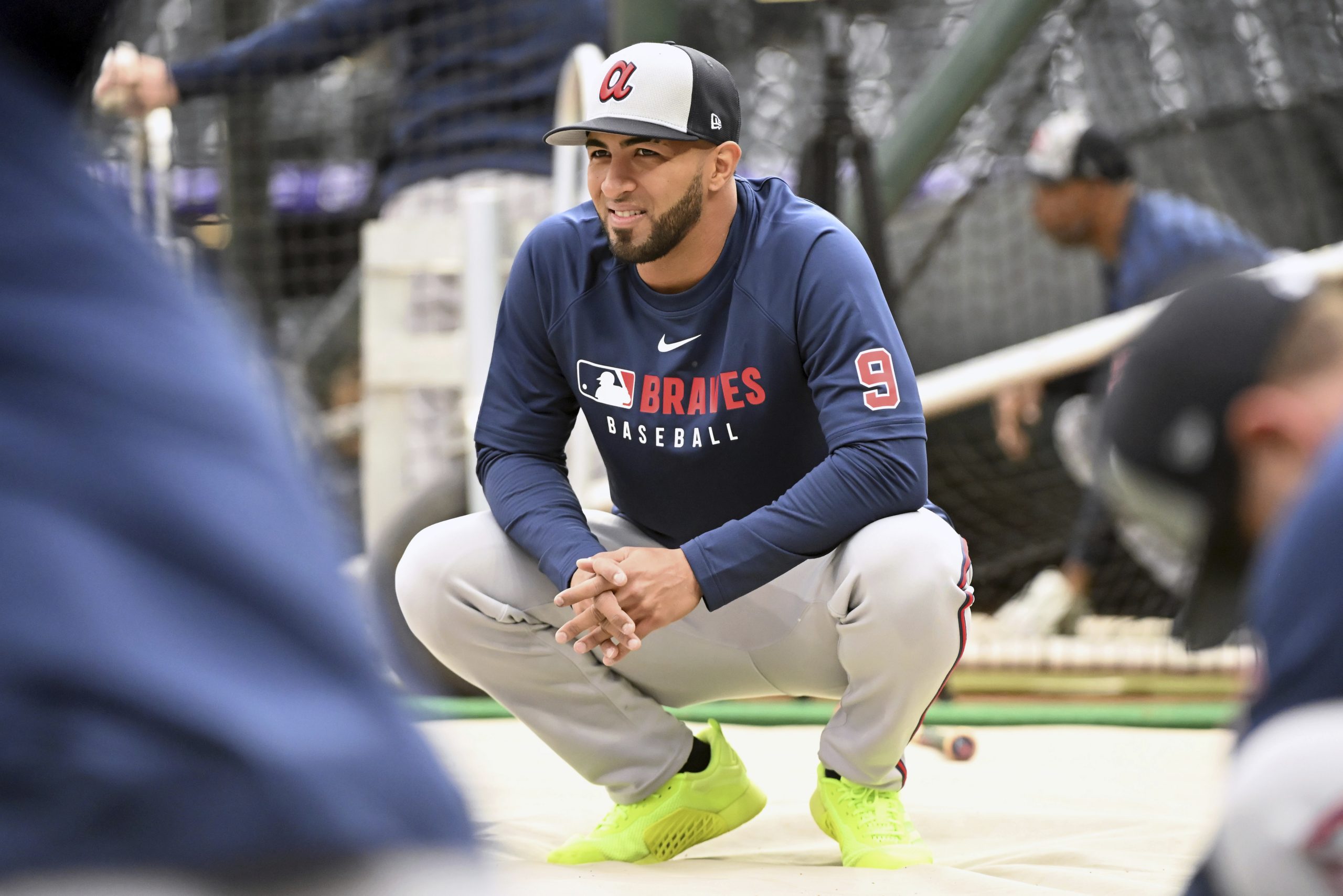 Photo: Atlanta Braves outfielder Eddie Rosario (9) stretches prior to a baseball game against the Colorado Rockies Tuesday, April 29, 2025, in Denver. (AP Photo/Geneva Heffernan)
