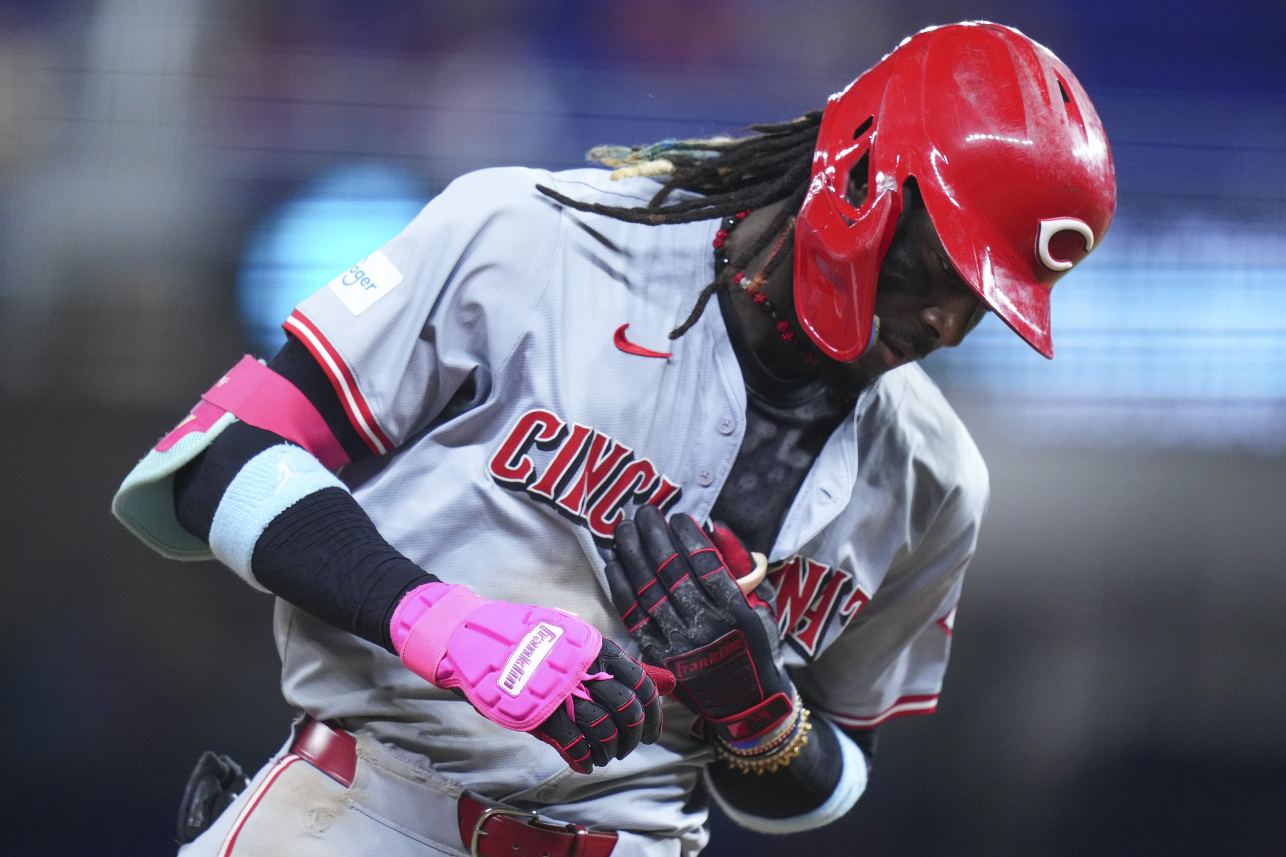 Photo Credit: Elly De La Cruz #44 of the Cincinnati Reds bows to the Marlins dugout while rounding the bases after hitting a home run against the Miami Marlins during the eighth inning at loanDepot park on August 05, 2024 in Miami, Florida. (Photo by Rich Storry/Getty Images)