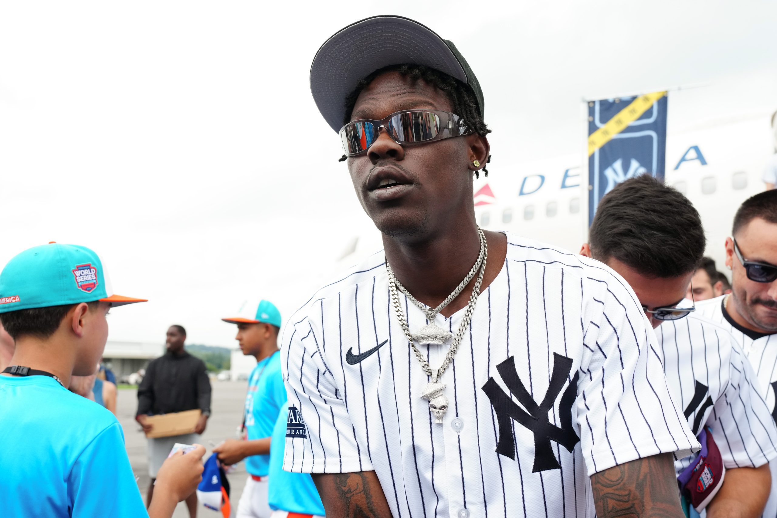 Yankees third baseman Jazz Chisholm Jr. soaked in the environment sitting in the stands with the kids from Team Bahamas at the Little League Classic at Journey Bank Ballpark at Historic Bowman Field in Williamsport, Pennsylvania, on August 18. Chisholm was born in Nassau, Bahamas, so that interaction really means a lot to those Little League kids who share his ethnicity.