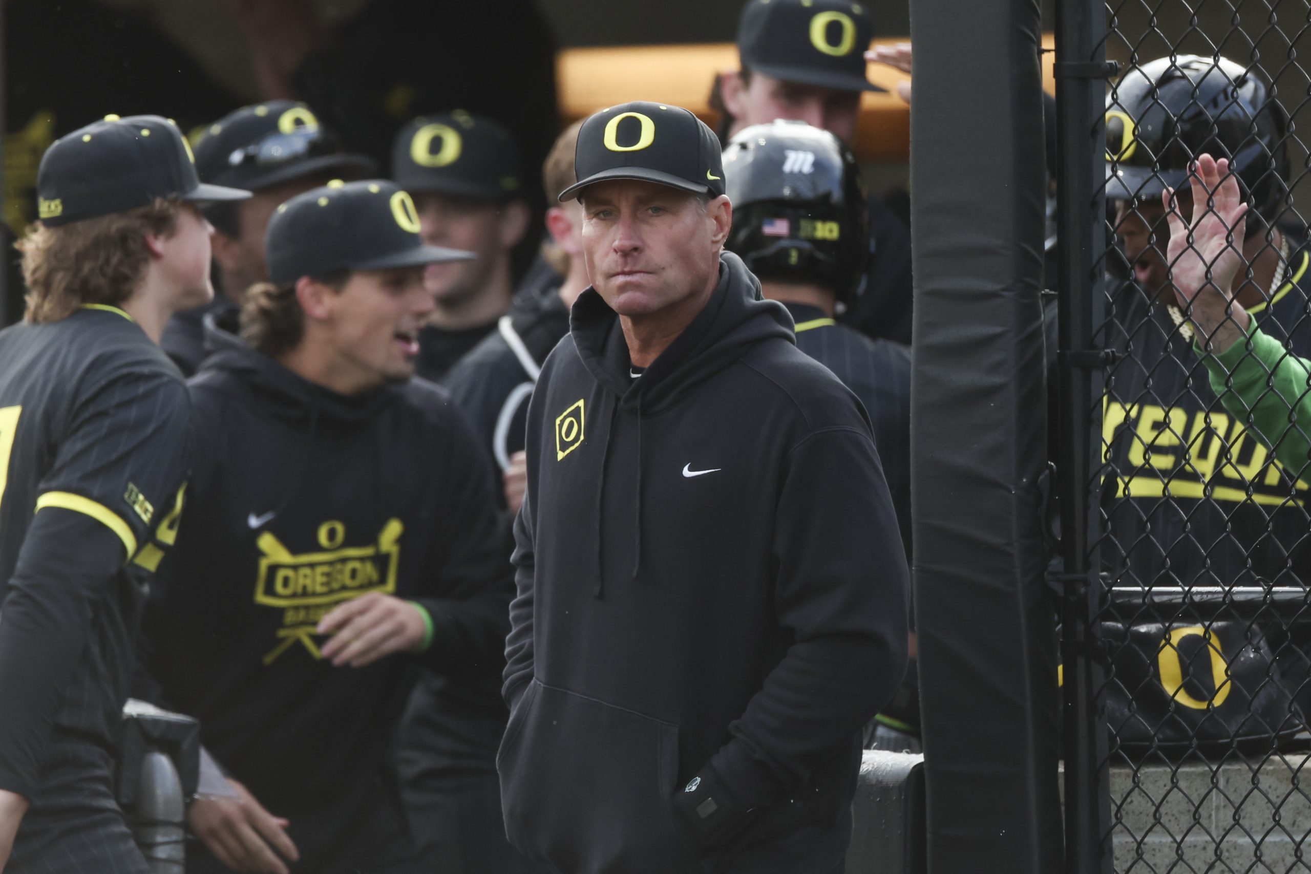 Photo: Oregon head coach Mark Wasikowski looks on during an NCAA baseball game against Portland on Wednesday, April 2, 2025, in Portland, Ore. (AP Photo/Amanda Loman)