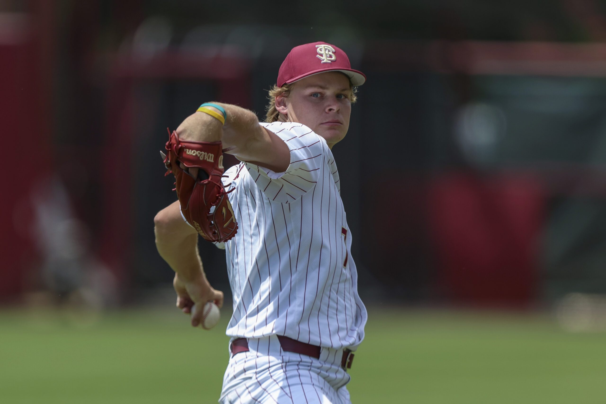 PHOTO: Florida State pitcher Wes Mendes (7) warms up before an NCAA regional baseball game against Bethune Cookman on Friday, May 30, 2025, in Tallahassee, Fla. (AP Photo/Gary McCullough)