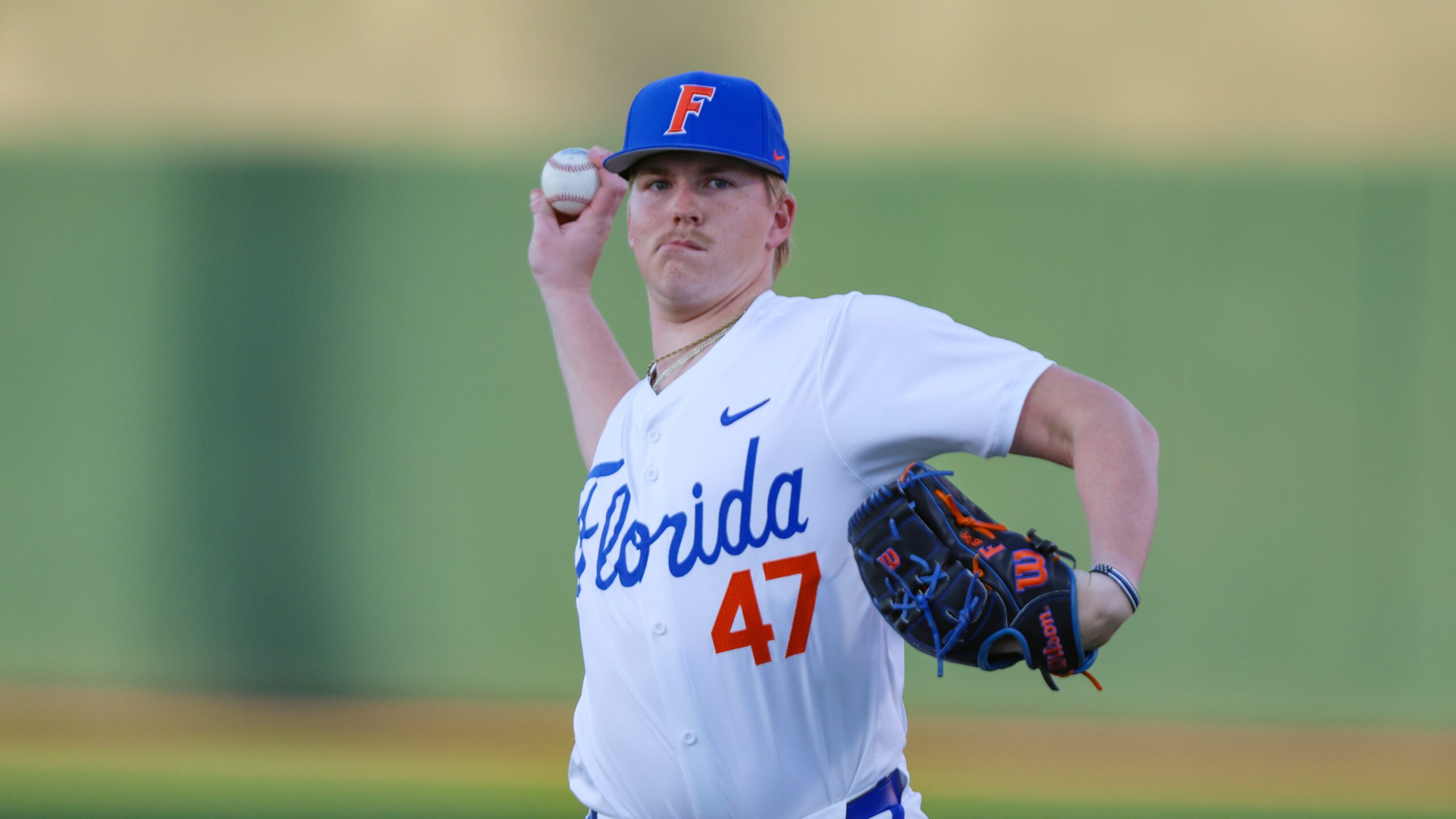 PHOTO: Florida pitcher Aidan King (47) warms up before an NCAA baseball game against UAB on Friday, Feb. 13, 2026, in Gainesville, Fla. (AP Photo/Gary McCullough)