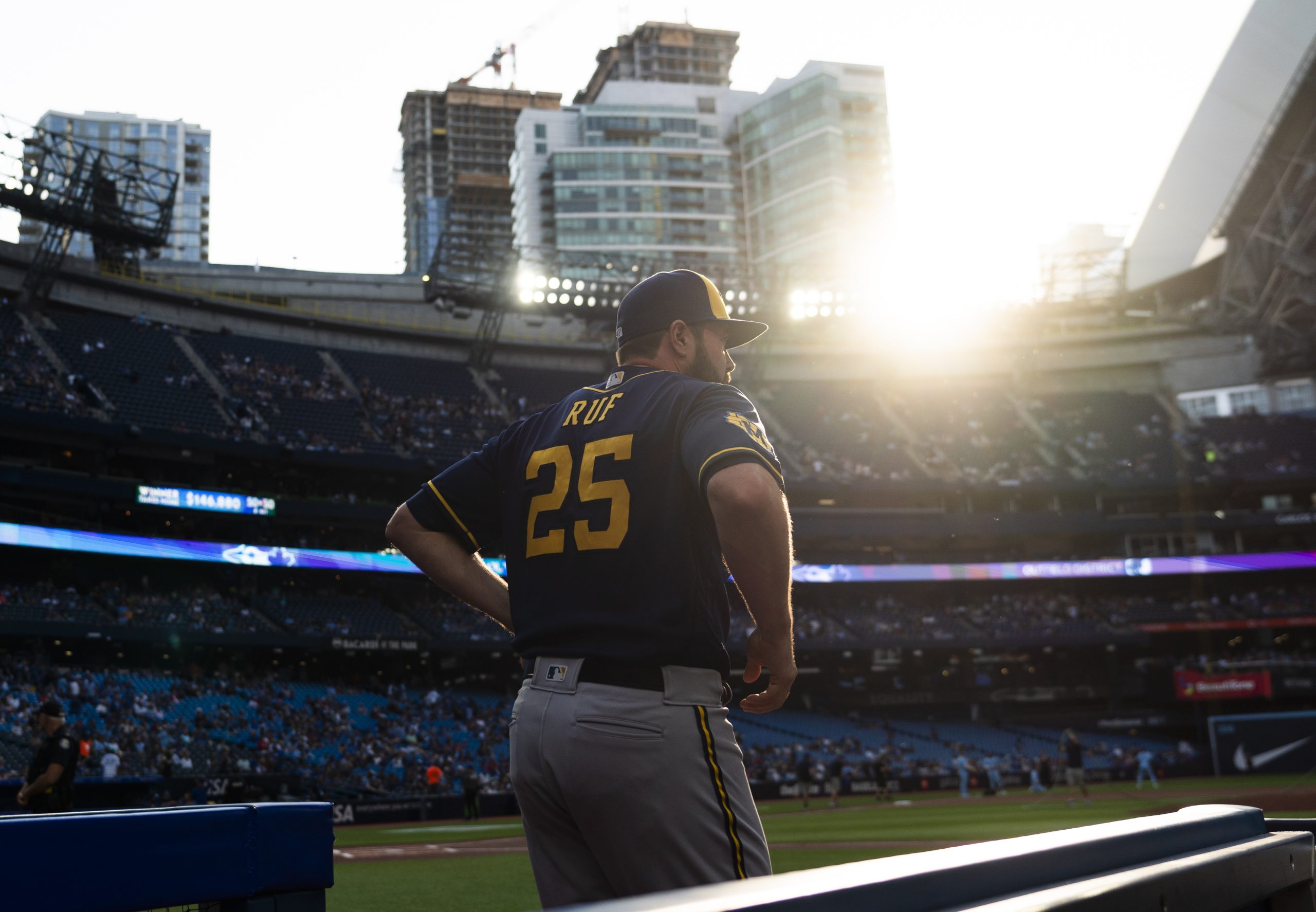 Photo Credit: Darin Ruf #25 of the Milwaukee Brewers takes the field against the Toronto Blue Jays in their MLB game at the Rogers Centre on May 30, 2023 in Toronto, Ontario, Canada. (Photo by Mark Blinch/Getty Images)