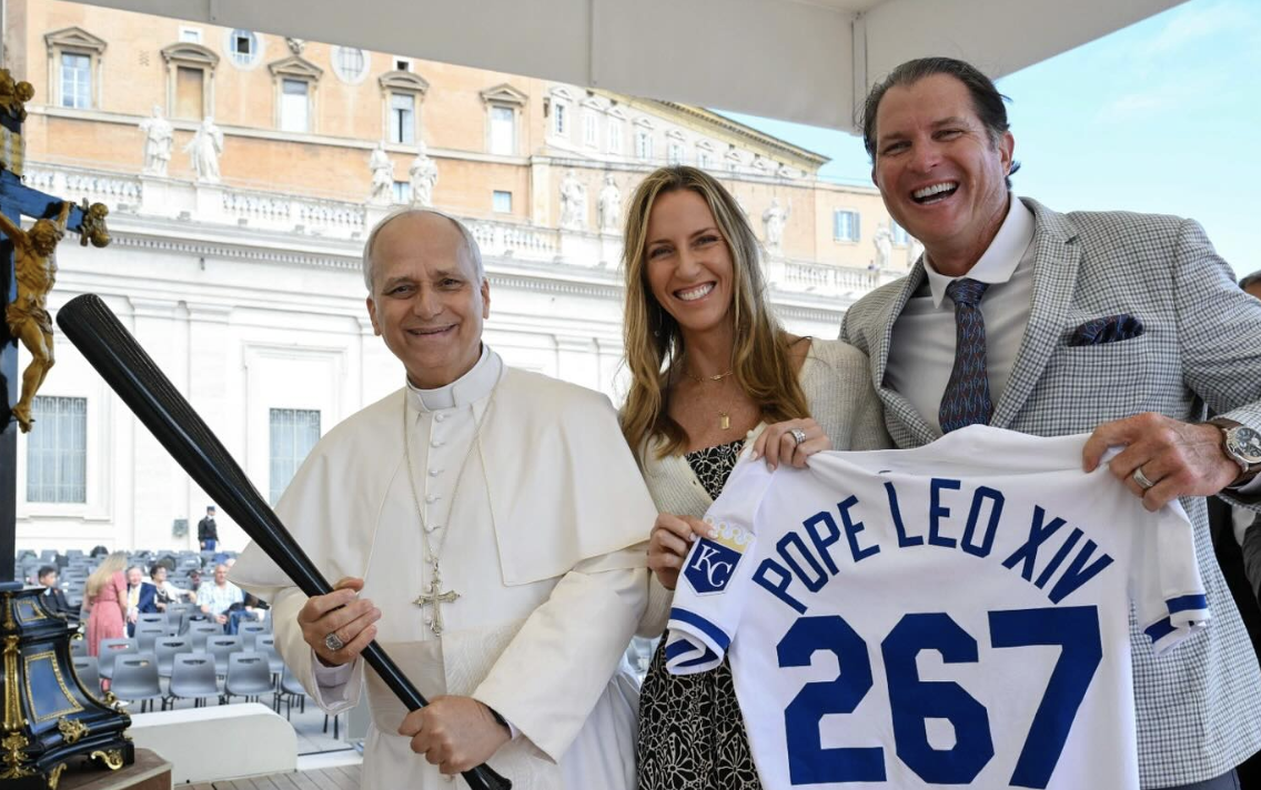 The baseball gifts and visitors continue for Pope Leo. Former Kansas City Royals first baseman Mike Sweeney and his wife, Shara, had the extraordinary honor of presenting Pope Leo XIV with a customized jersey and baseball bat inside Vatican City.