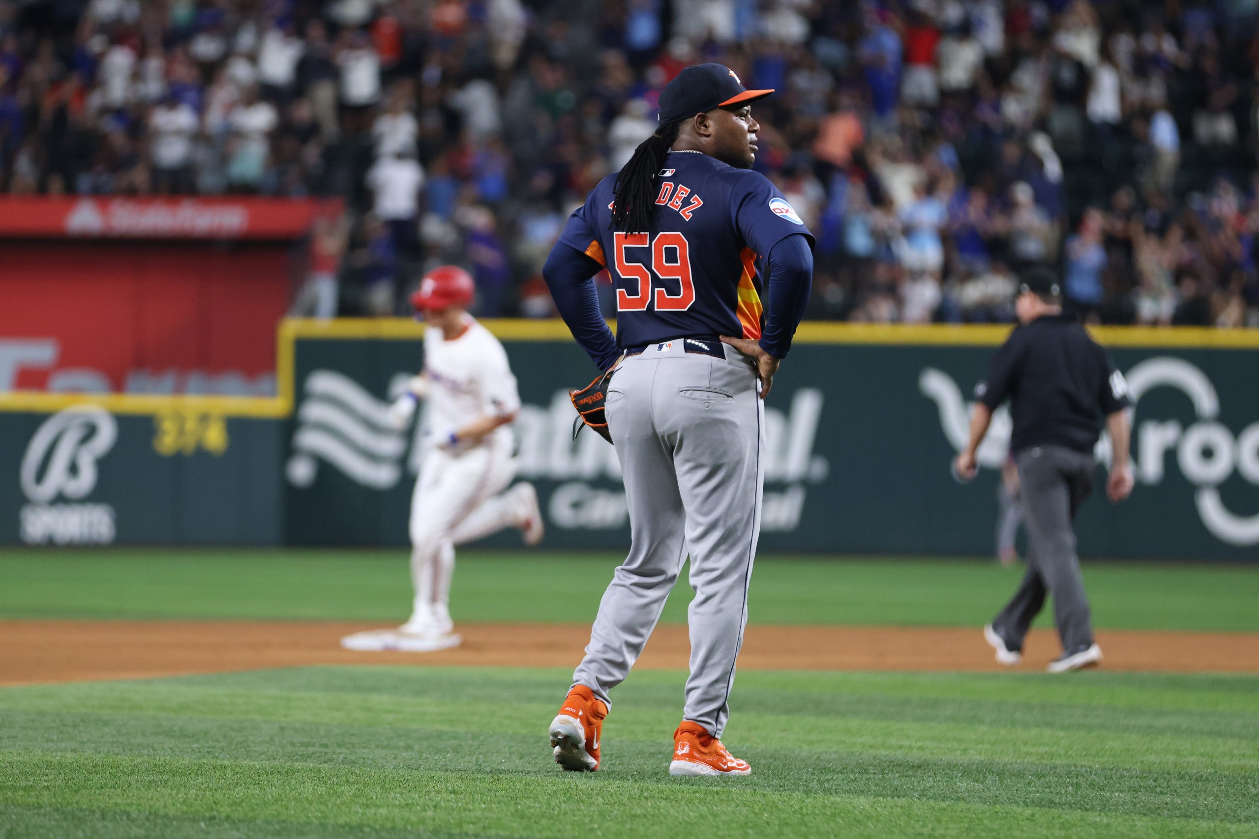 Photo Credit: Framber Valdez #59 of the Houston Astros reacts after losing his no-hitter against the Texas Rangers in the ninth inning at Globe Life Field on August 06, 2024 in Arlington, Texas. (Photo by Tim Heitman/Getty Images)