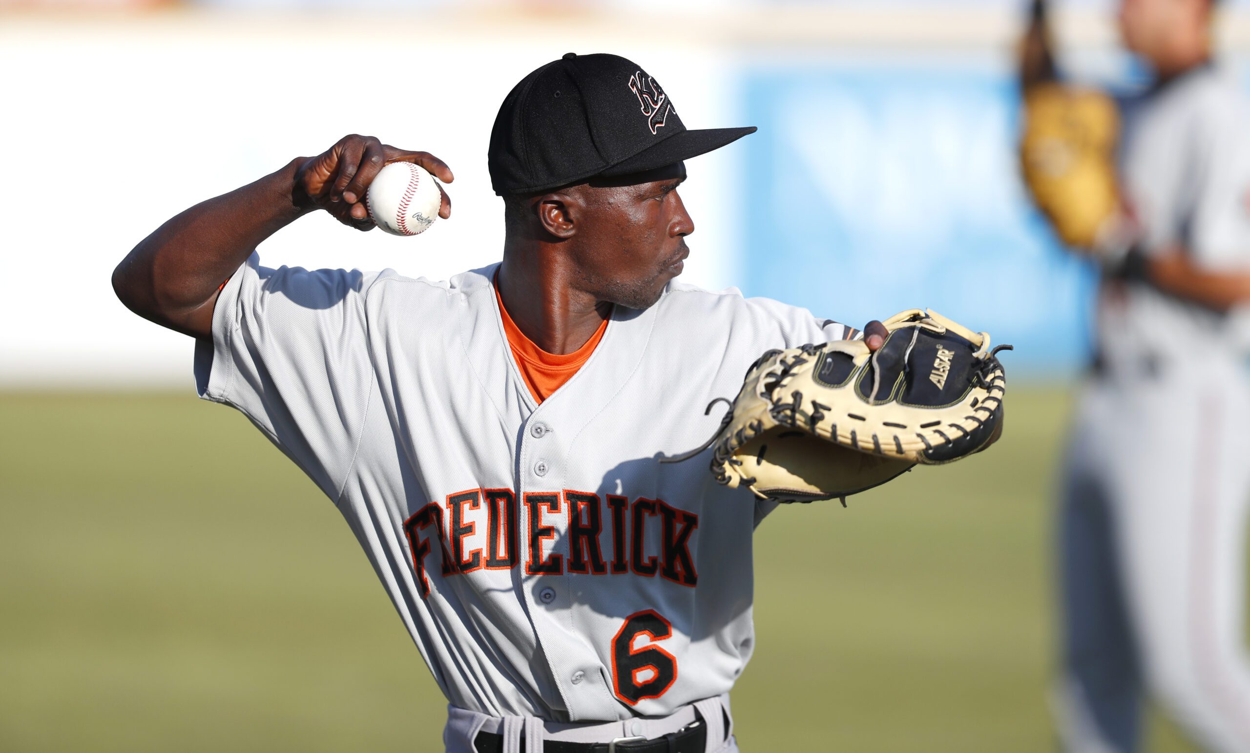 Photo: Dennis Kasumba warms up for the team’s baseball game against the Trenton Thunder, Tuesday, July 4, 2023, in Trenton, N.J. Kasumba, from Uganda, dreams of reaching the major leagues someday. The 19-year-old catcher had a chance to play for the Frederick Keys of the MLB Draft League this past month. (AP Photo/Noah K. Murray)