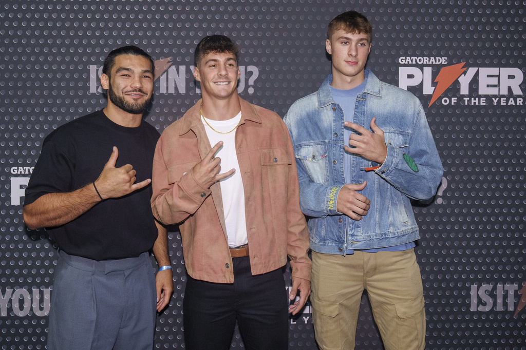 Los Angeles Rams wide receiver Puka Nacua, left, Konnor Griffin, middle, and Cooper Flagg arrive at the Gatorade National Players of the Year gala in Los Angeles Wednesday, July 10, 2024. (AP Photo/Damian Dovarganes)