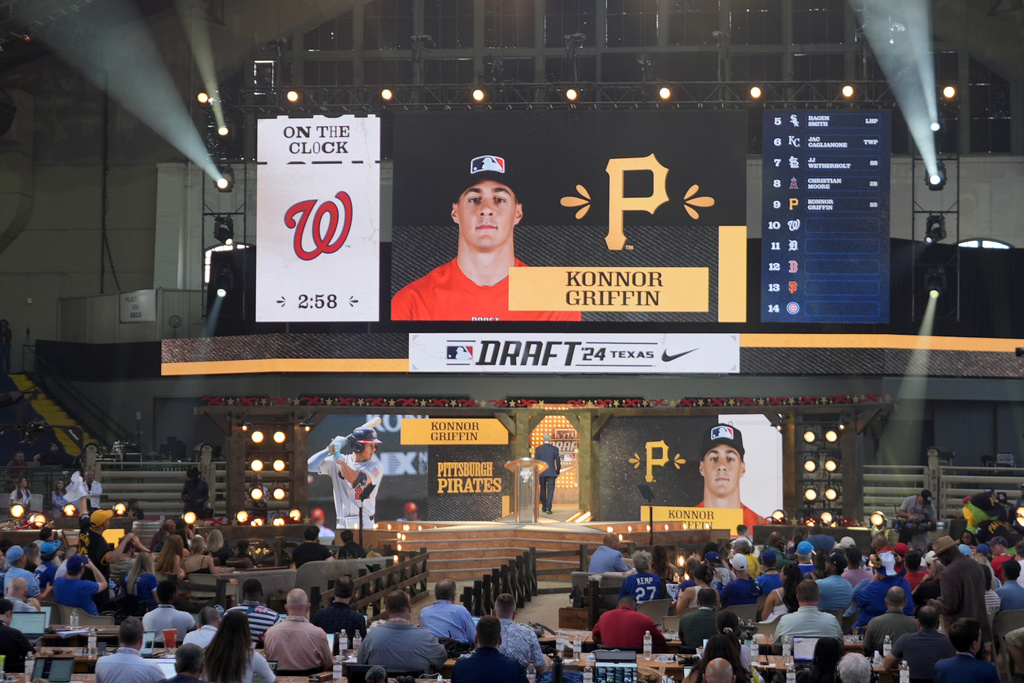 A photo of Konnor Griffin is displayed on the video board after Griffin was selected ninth overall by the Pittsburgh Pirates in the first round of the MLB baseball draft in Fort Worth, Texas, Sunday, July 14, 2024. (AP Photo/LM Otero)