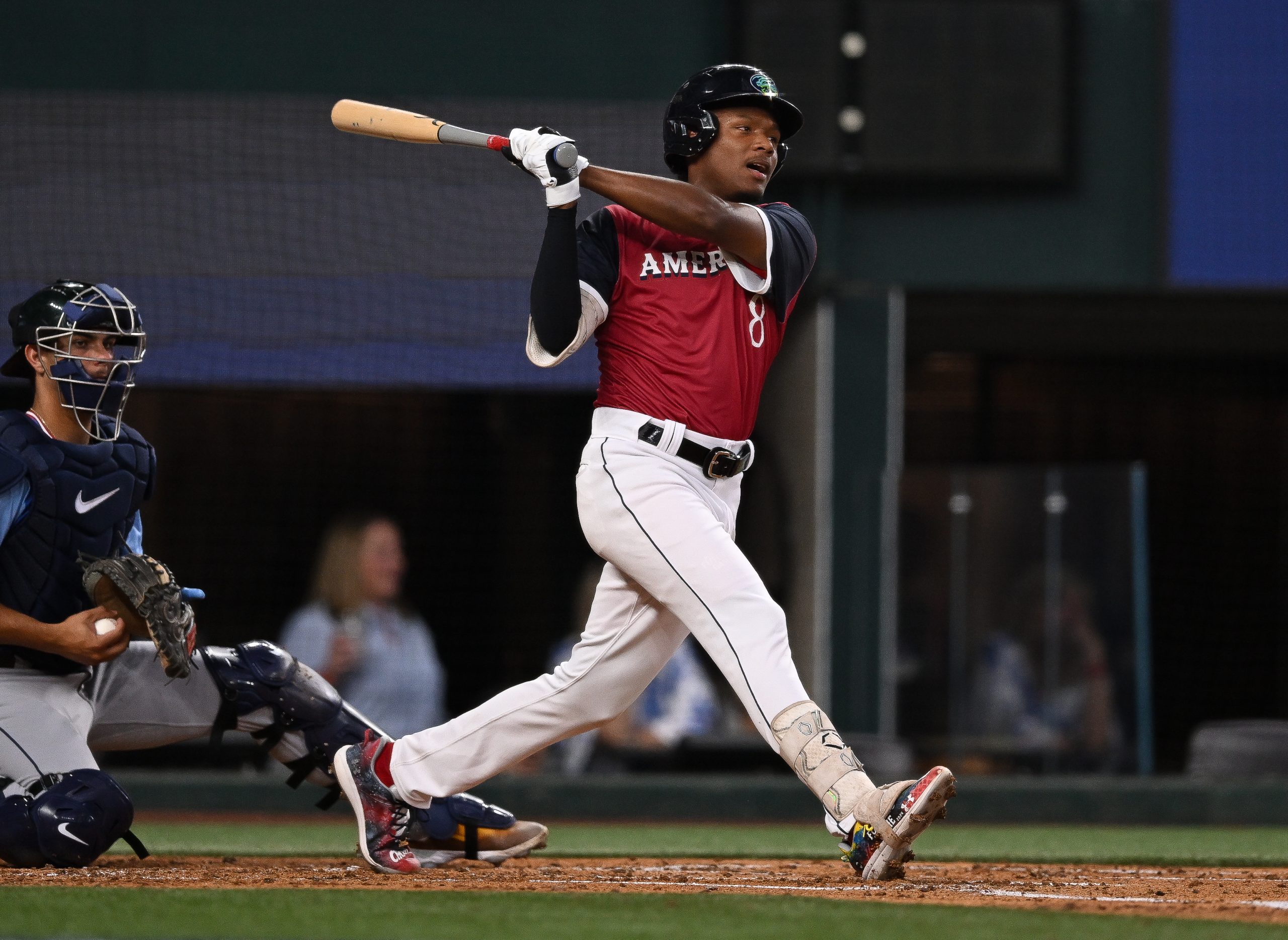 Photo Credit: Jaison Chourio #8 of AL Future team hitting at Globe Life Field on July 13, 2024 in Arlington, Texas. (Photo by Gene Wang/Getty Images)