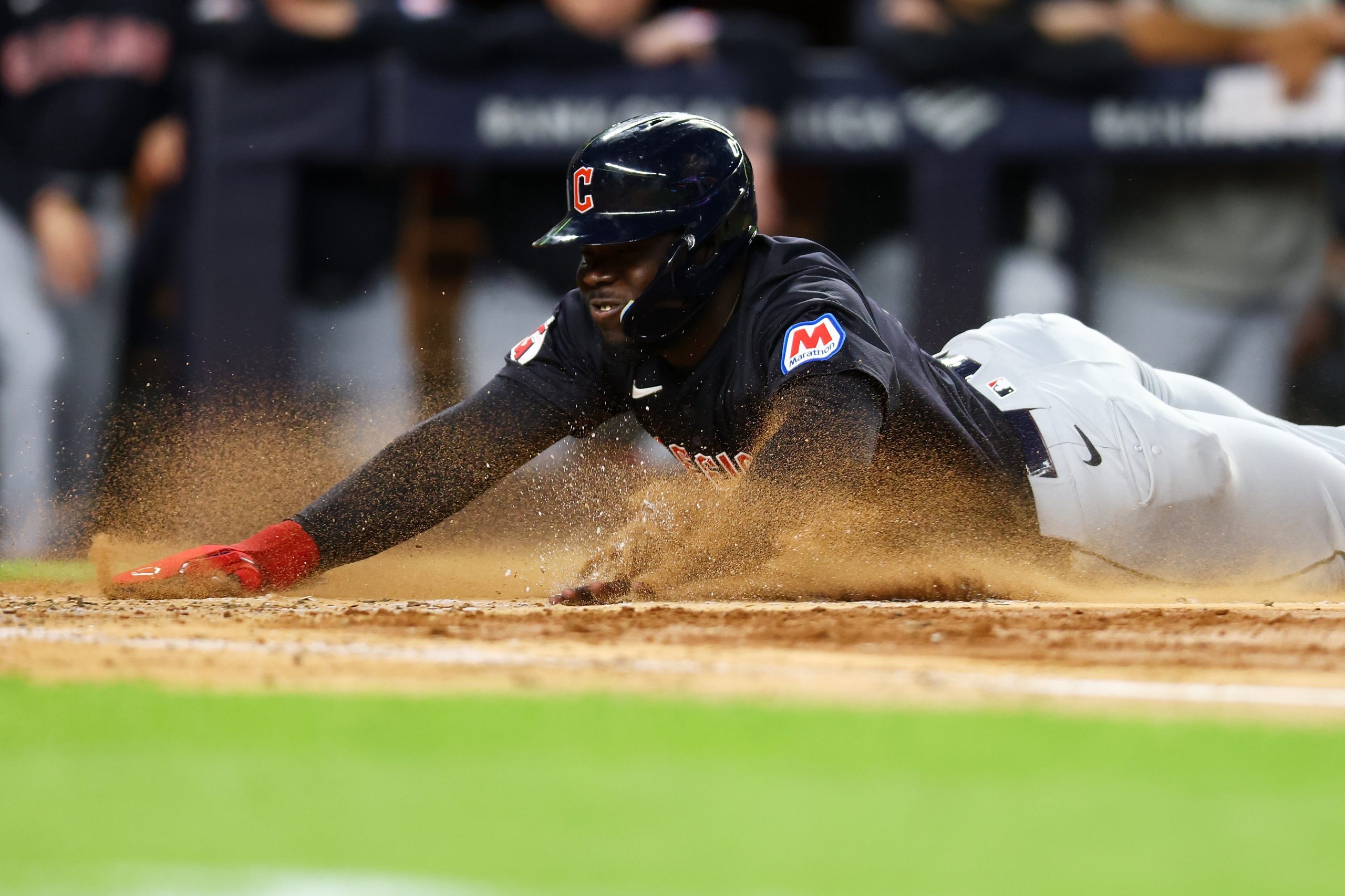 Photo Credit: Jhonkensy Noel #43 of the Cleveland Guardians scorers an a single. MLB. (Photo by Mike Stobe/Getty Images)