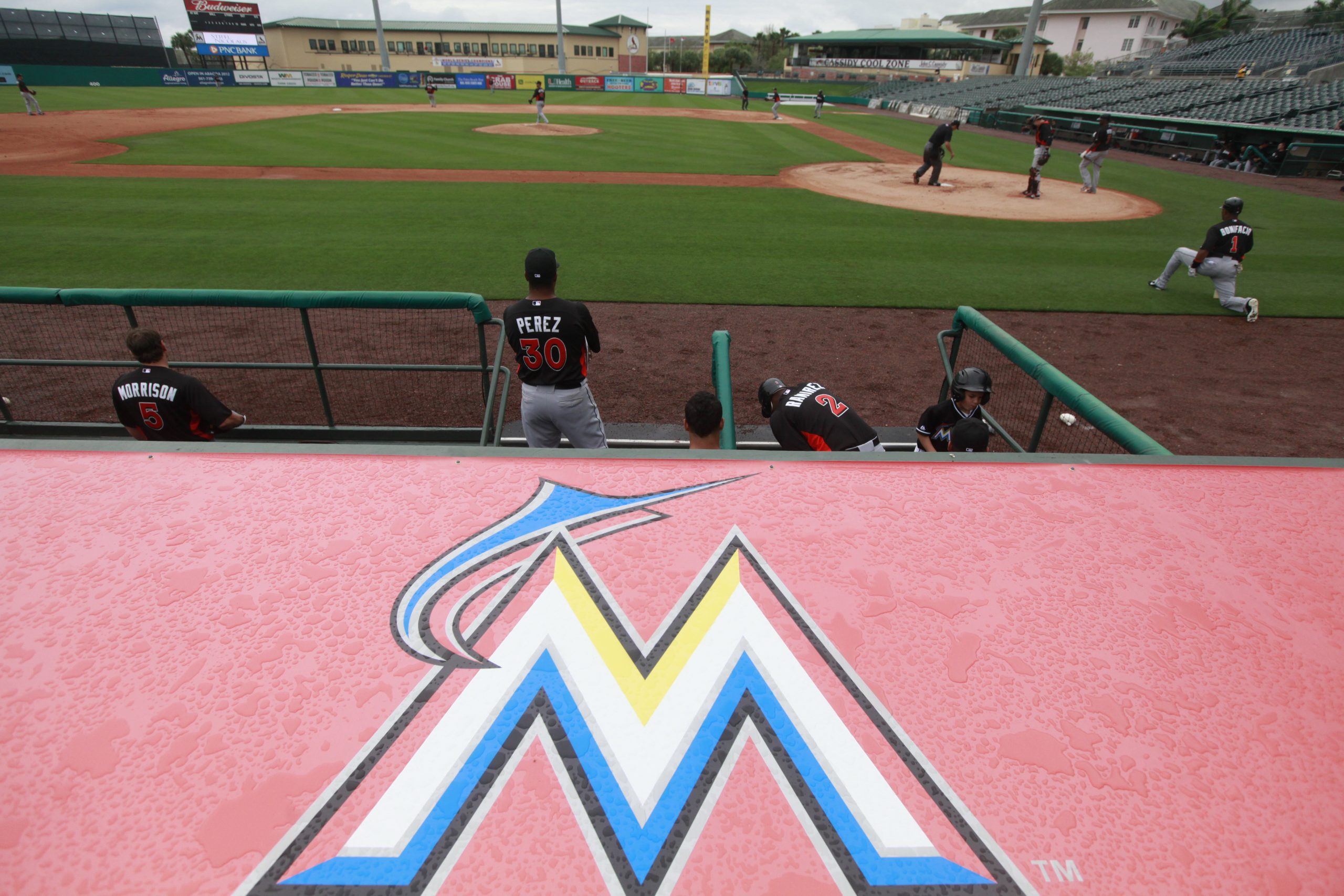 Photo: The new Miami Marlins logo is seen over their dugout during an intrasquad spring training baseball game Sunday, March 4, 2012, in Jupiter, Fla. (AP Photo/Jeff Roberson)