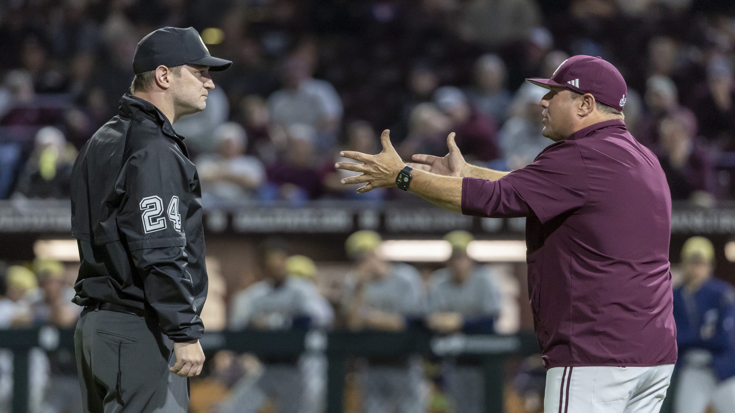 Photo: Mississippi State head coach Chris Lemonis argues a balk call with an umpire during an NCAA baseball game against Queens on Friday, March 7, 2025, in Starkville, Miss. (AP Photo/Vasha Hunt)