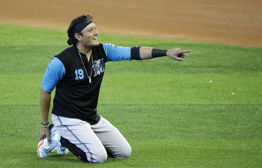 Miami Marlins’ Miguel Rojas smiles as he warms up during a baseball workout at Marlins Park, Saturday, July 4, 2020, in Miami.