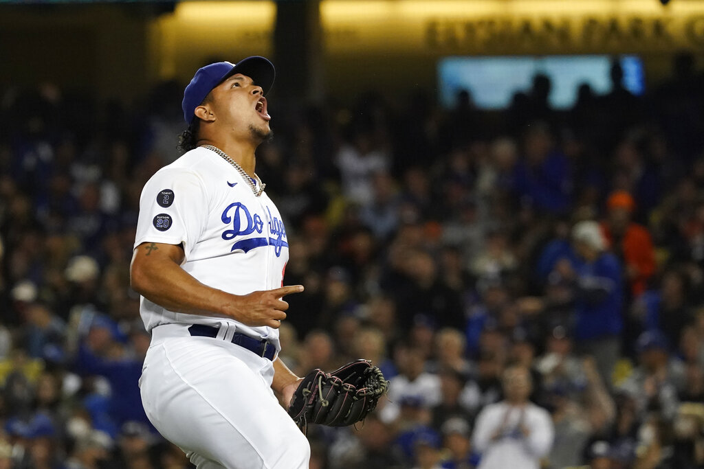 Los Angeles Dodgers relief pitcher Brusdar Graterol reacts after San Francisco Giants’ Evan Longoria grounded out to end the top of the sixth inning of Game 4 of a baseball National League Division Series, Tuesday, Oct. 12, 2021, in Los Angeles. (AP Photo/Marcio Jose Sanchez)
