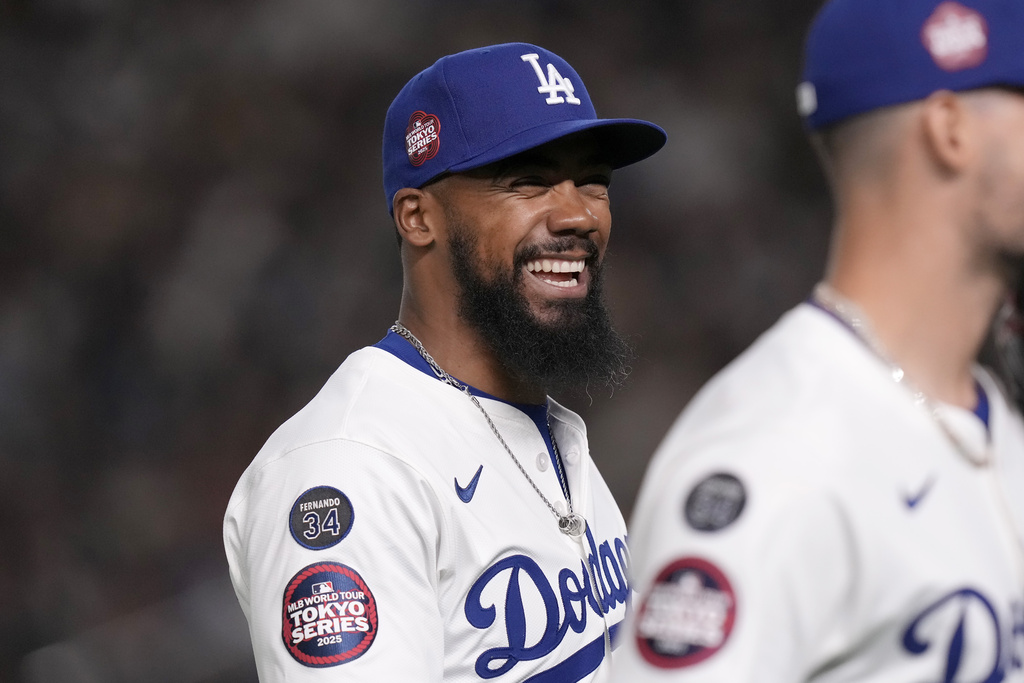 Los Angeles Dodgers’ Teoscar Hernández smiles during the second inning in an MLB Japan Series exhibition baseball game against the Hanshin Tigers, Sunday, March 16, 2025, in Tokyo. (AP Photo/Eugene Hoshiko)