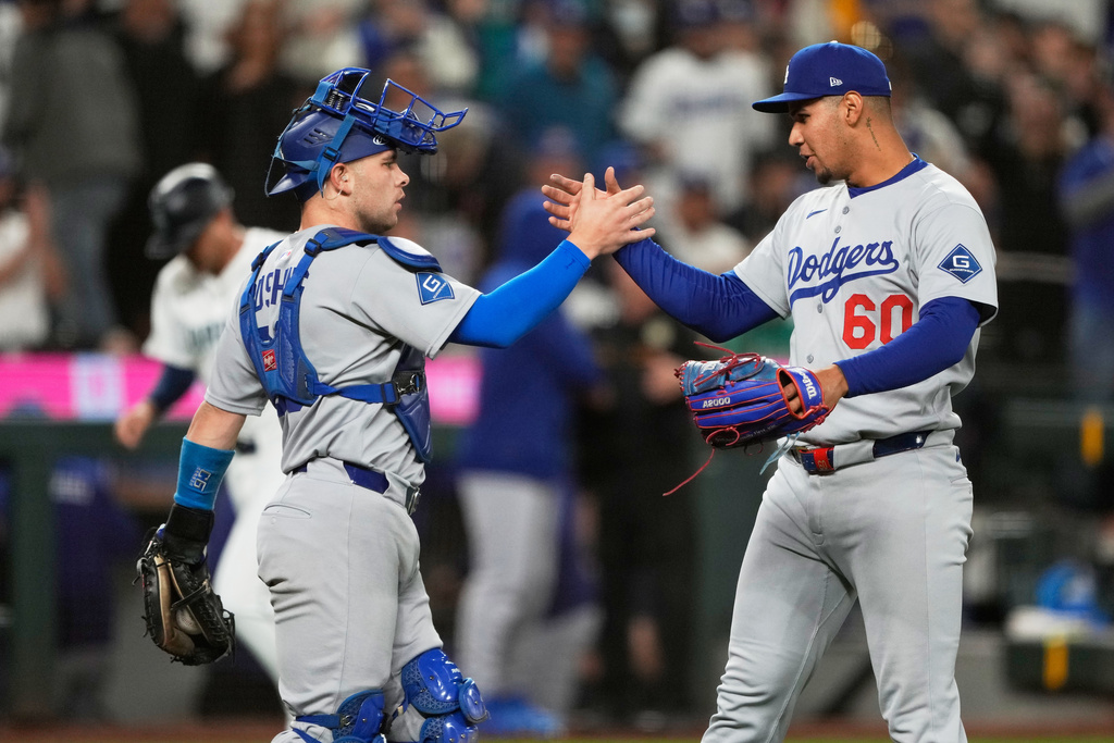 Los Angeles Dodgers relief pitcher Edgardo Henriquez, right, and catcher Dalton Rushing celebrate after the team’s win in a baseball game against the Seattle Mariners, Saturday, Sept. 27, 2025, in Seattle. (AP Photo/Ryan Sun)
