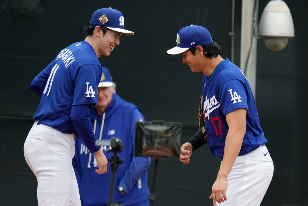 Los Angeles Dodgers pitchers Shohei Ohtani, right, of Japan, and Roki Sasaki, of Japan, smile as they talk during a throwing session during spring training baseball Friday, Feb. 13, 2026, in Phoenix. (AP Photo/Ross D. Franklin)