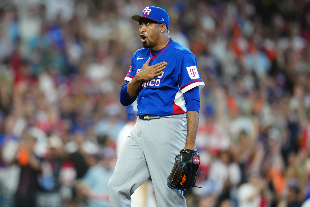 Puerto Rico pitcher Edwin Díaz reacts during the eighth inning of a World Baseball Classic quarterfinal game against Italy, Saturday, March 14, 2026, in Houston. (AP Photo/Karen Warren)