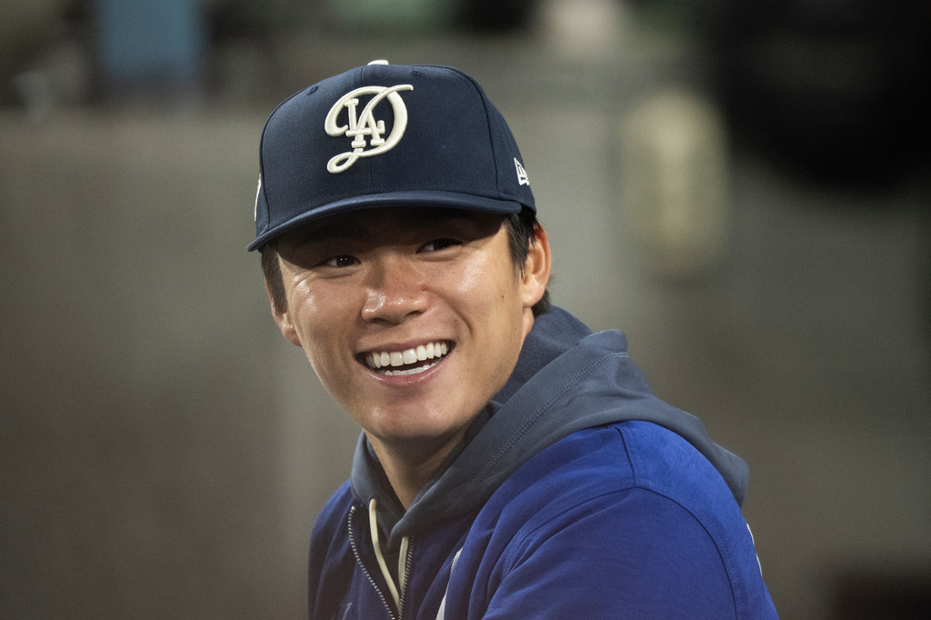 Los Angeles Dodgers’ Yoshinobu Yamamoto smiles in the dugout during the ninth inning of a baseball game against the Texas Rangers in Los Angeles, Saturday, April 11, 2026. (AP Photo/Kyusung Gong)