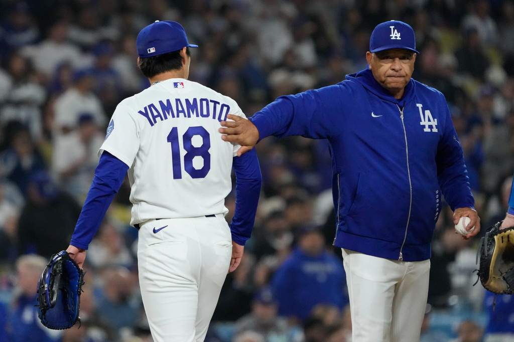 Los Angeles Dodgers starting pitcher Yoshinobu Yamamoto, left, gets a pat on the back from head coach Dave Roberts as he is taken out of the game during the eighth inning of a baseball game against the New York Mets, Tuesday, April 14, 2026, in Los Angeles. (AP Photo/Mark J. Terrill)