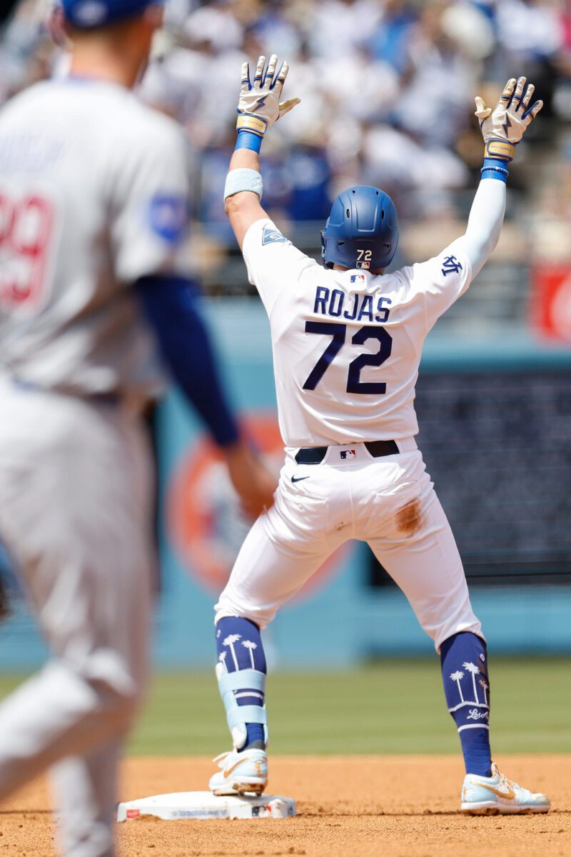 Los Angeles Dodgers’ Miguel Rojas (72) reacts after hitting a two-run double, scoring teammates Kyle Tucker and Teoscar Hernandez, during the first inning of a baseball game against the Chicago Cubs, Sunday, April 26, 2026, in Los Angeles. (AP Photo/Caroline Brehman)