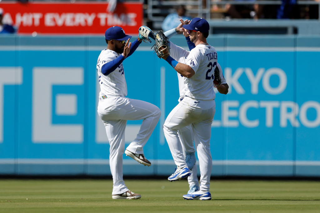 Los Angeles Dodgers left fielder Teoscar Hernandez (37), Dodgers center fielder Andy Pages (44) and Dodgers right fielder Kyle Tucker (23) react after a win over the Chicago Cubs during a baseball game Sunday, April 26, 2026, in Los Angeles. (AP Photo/Caroline Brehman)