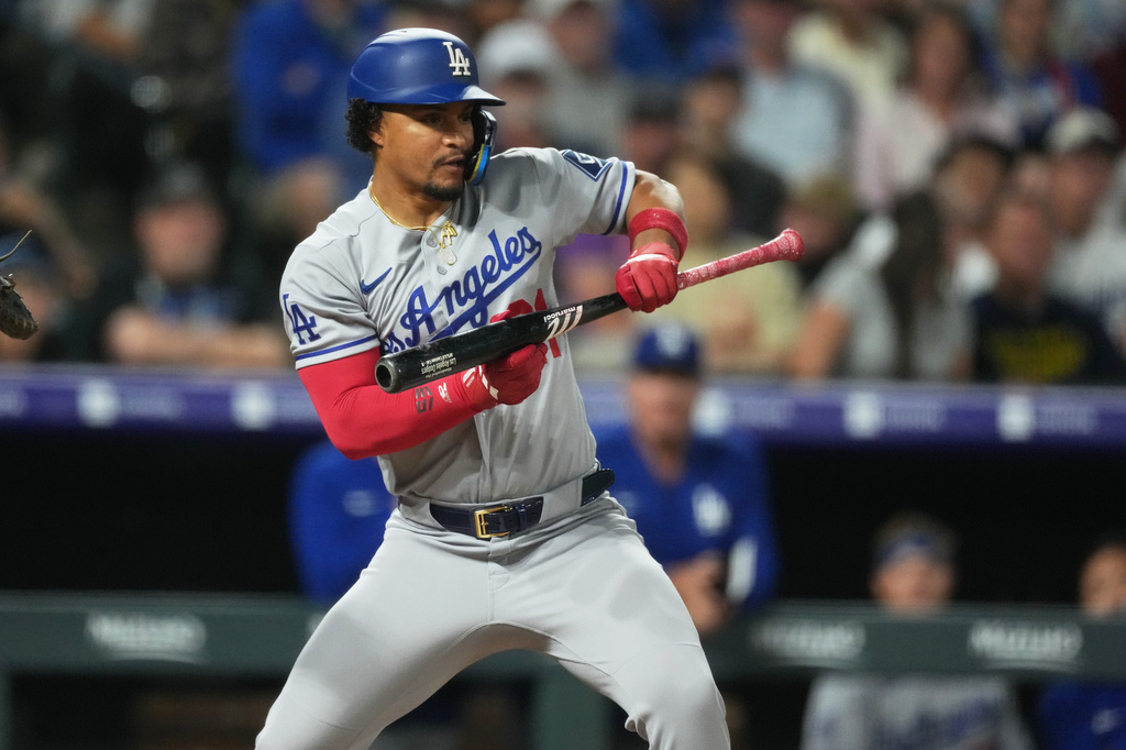 Los Angeles Dodgers third baseman Santiago Espinal (21) in the sixth inning of a baseball game Monday, April 20, 2026, in Denver. (AP Photo/David Zalubowski)