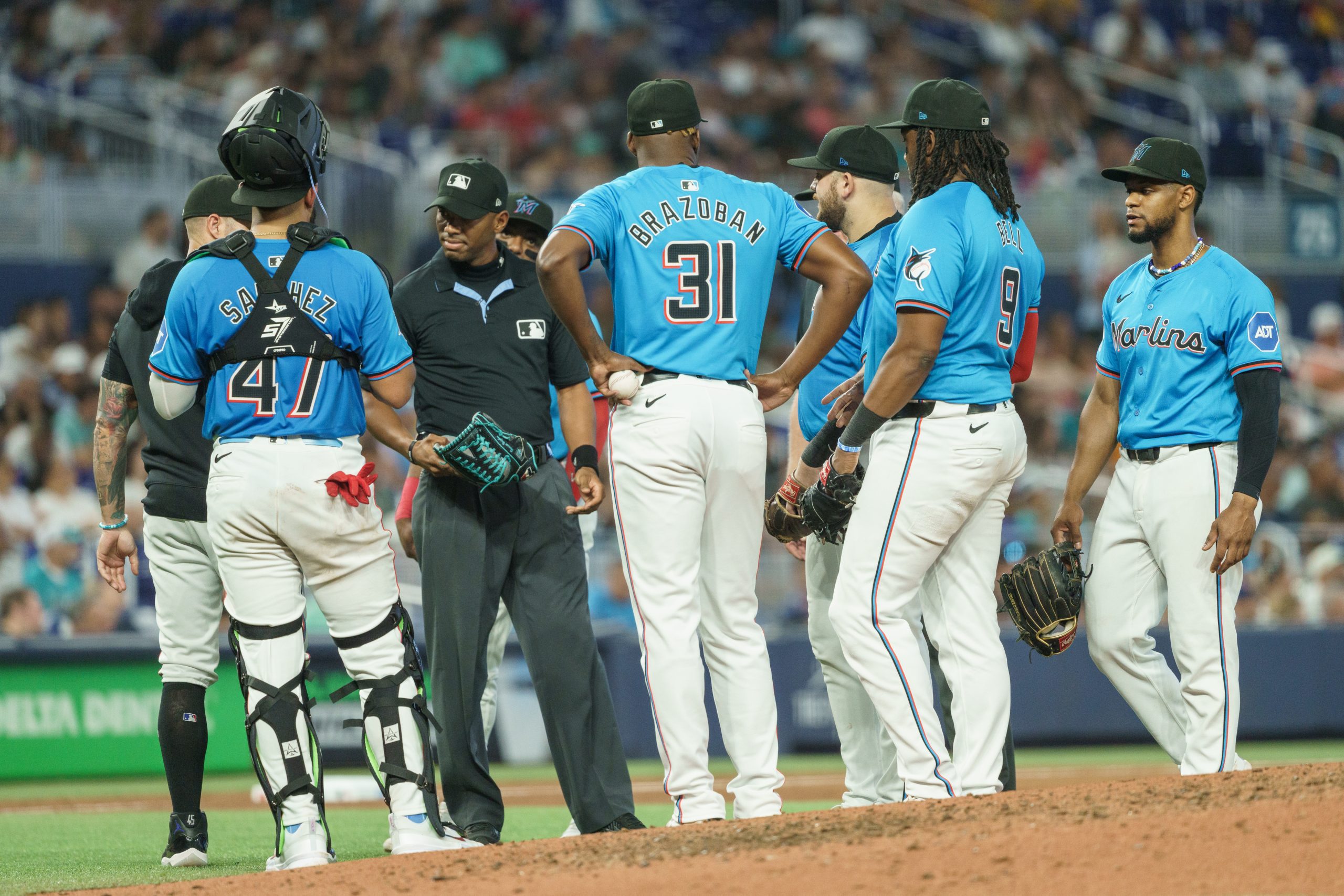 Photo Credit: MLB umpire Edwin Moscoso (C) holds Huascar Brazobán #31 of the Miami Marlins glove during an inspection in the seventh inning against the Seattle Mariners at loanDepot park on June 23, 2024 in Miami, Florida. (Photo by Bryan Cereijo/Getty Images)