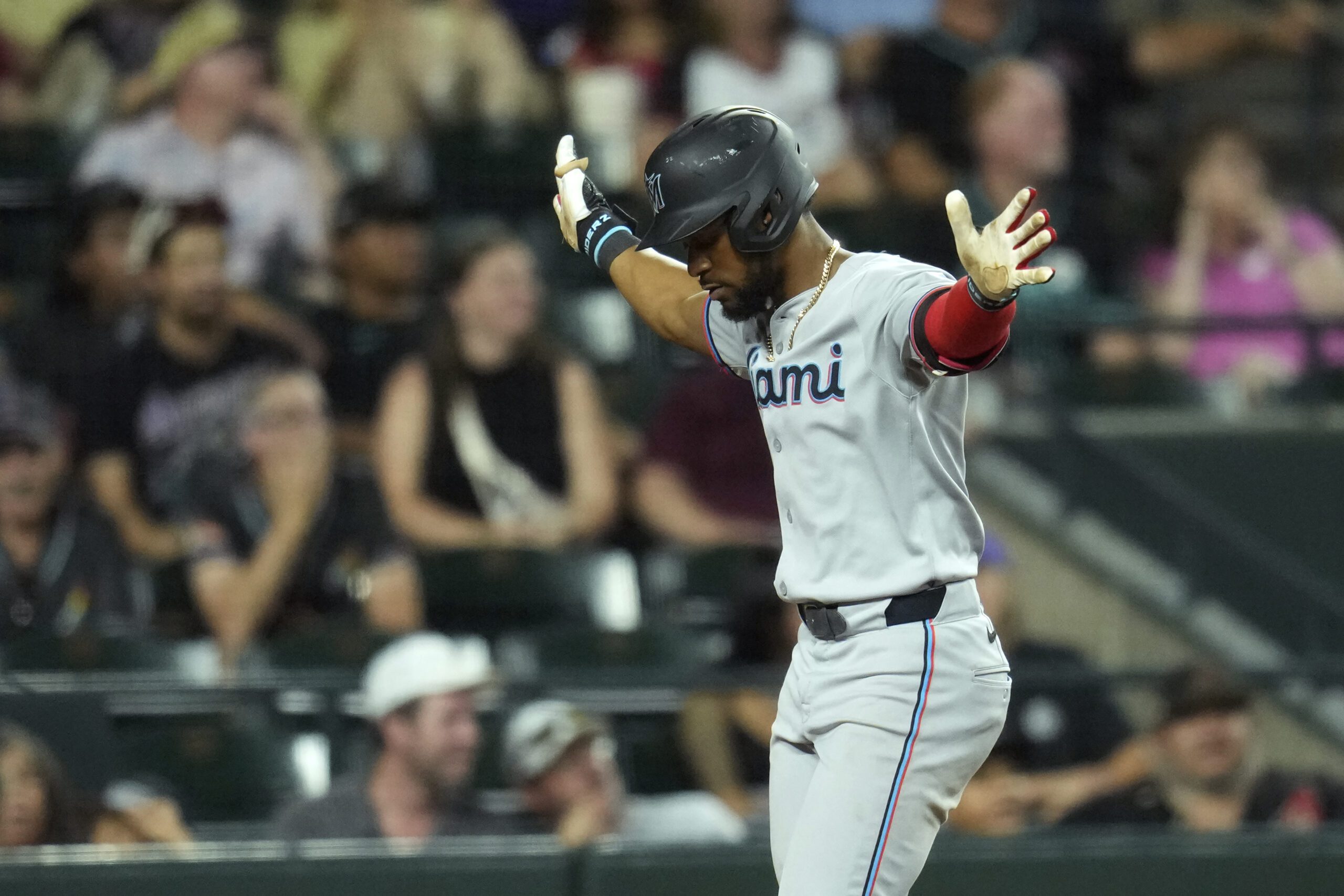 Photo: Miami Marlins’ Otto Lopez celebrates his two-run home run against the Arizona Diamondbacks during the ninth inning of a baseball game Friday, June 27, 2025, in Phoenix. (AP Photo/Ross D. Franklin)