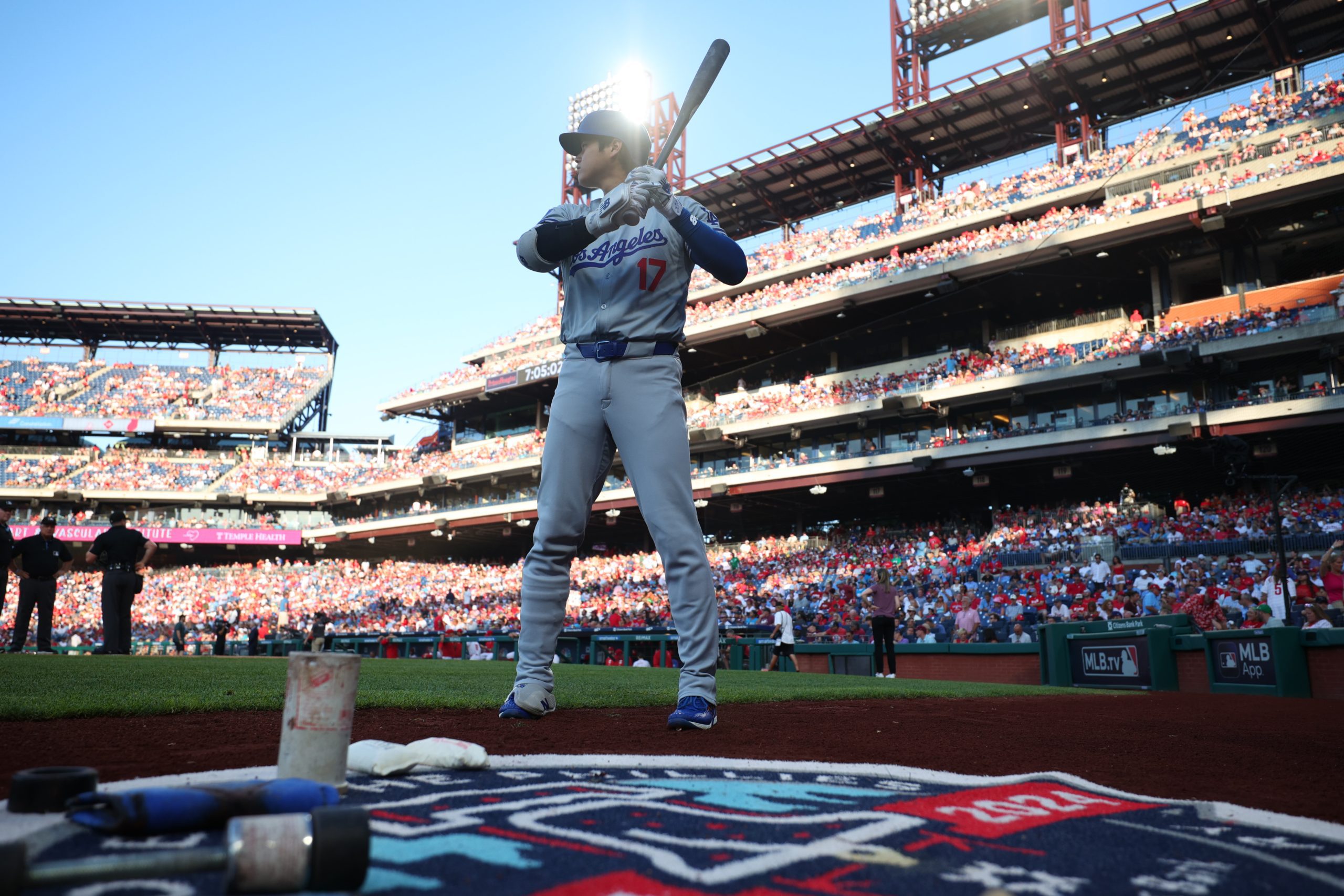 Photo Credit: Shohei Ohtani #17 of the Los Angeles Dodgers warms up in the on deck circle prior to the game against the Philadelphia Phillies. (Photo by Heather Barry/Getty Images)