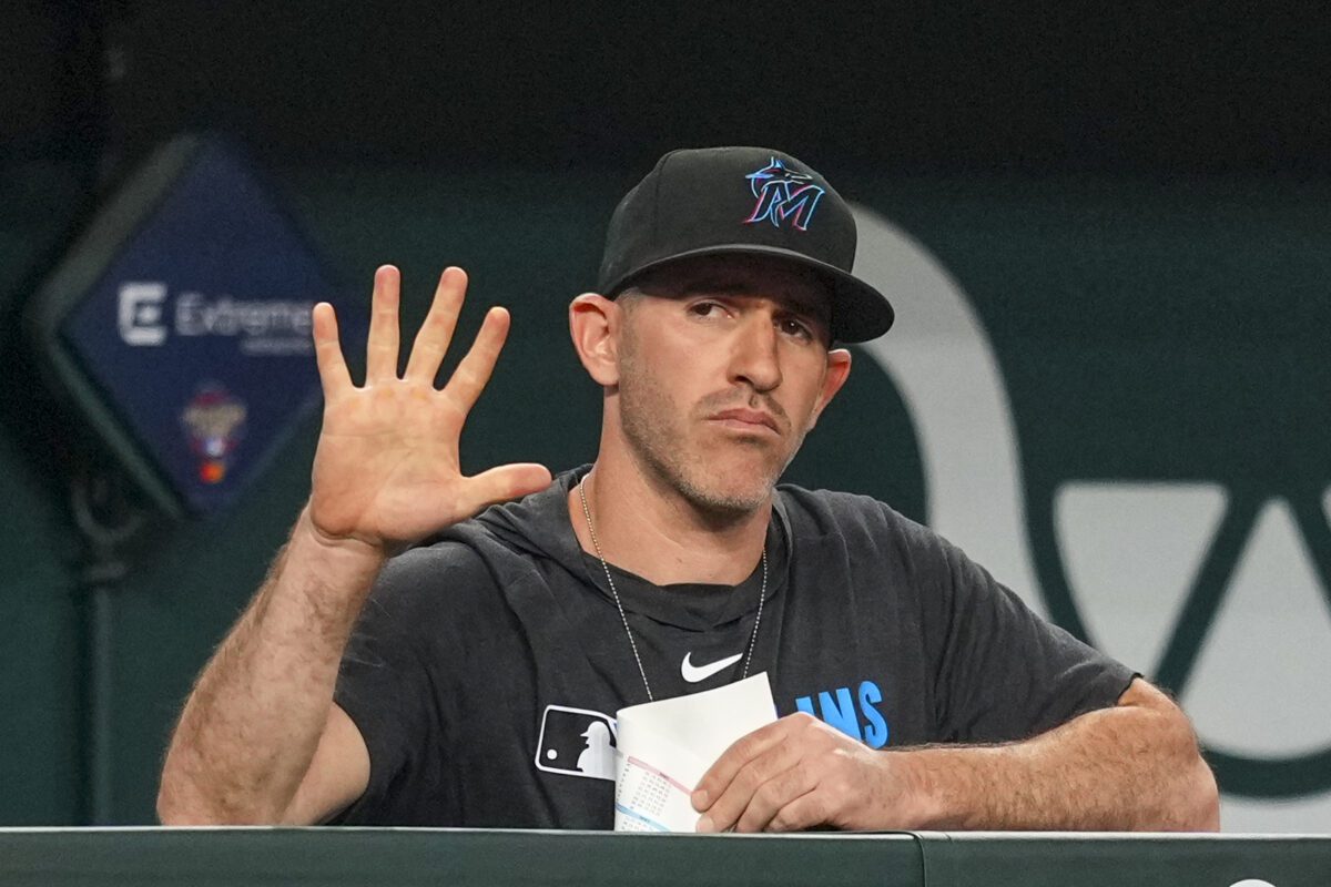 Photo: Miami Marlins assistant pitching coach & assistant pitching director Alon Leichman gestures signs toward catcher Agustín Ramírez during the eighth inning of a baseball game Saturday, Sept. 20, 2025, in Arlington, Texas. (AP Photo/Julio Cortez)