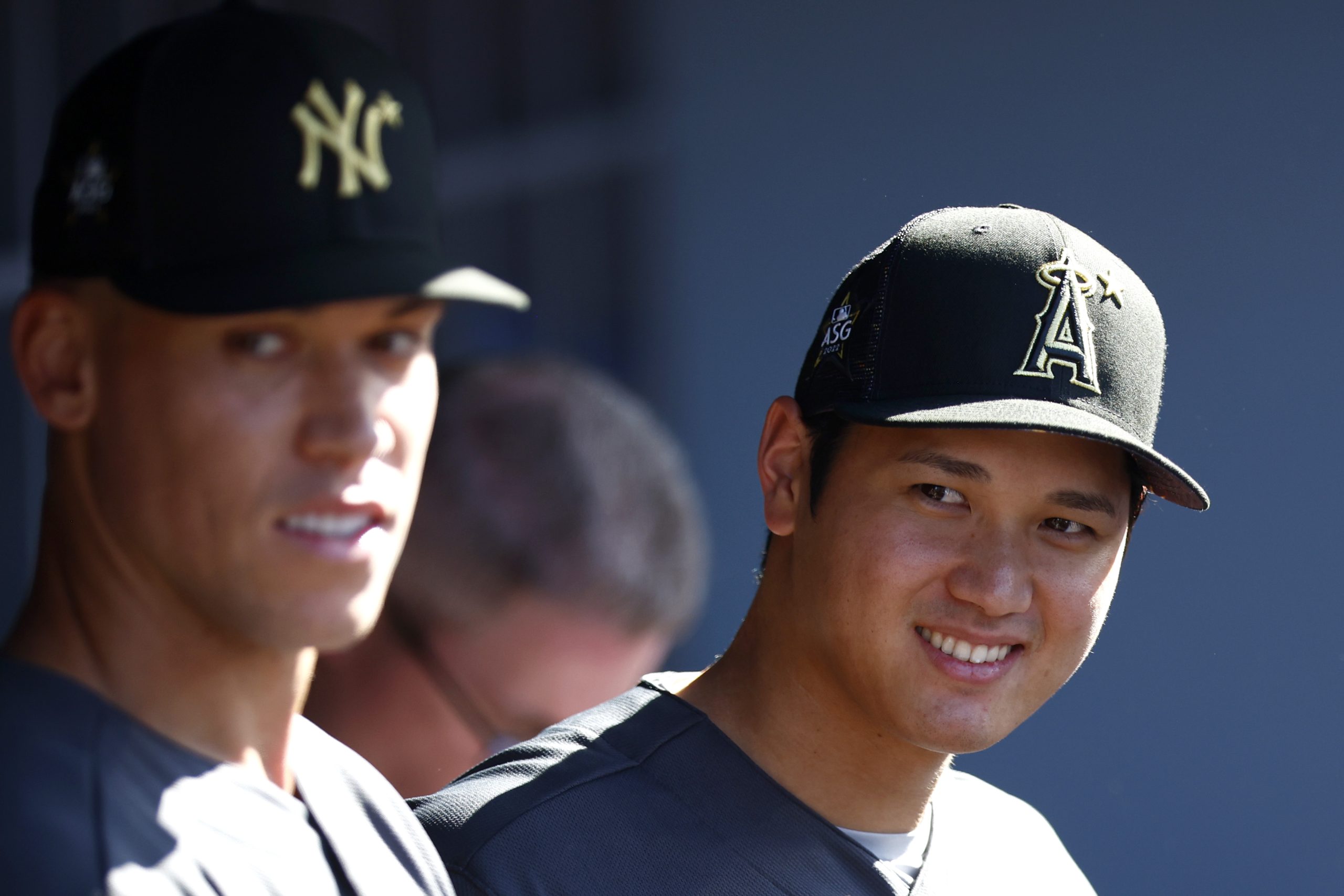 Photo Credit: Aaron Judge #99 of the New York Yankees and Shohei Ohtani #17 of the Los Angeles Angels look on from the dugout before the 92nd MLB All-Star Game presented by Mastercard at Dodger Stadium on July 19, 2022 in Los Angeles, California. (Photo by Ronald Martinez/Getty Images)