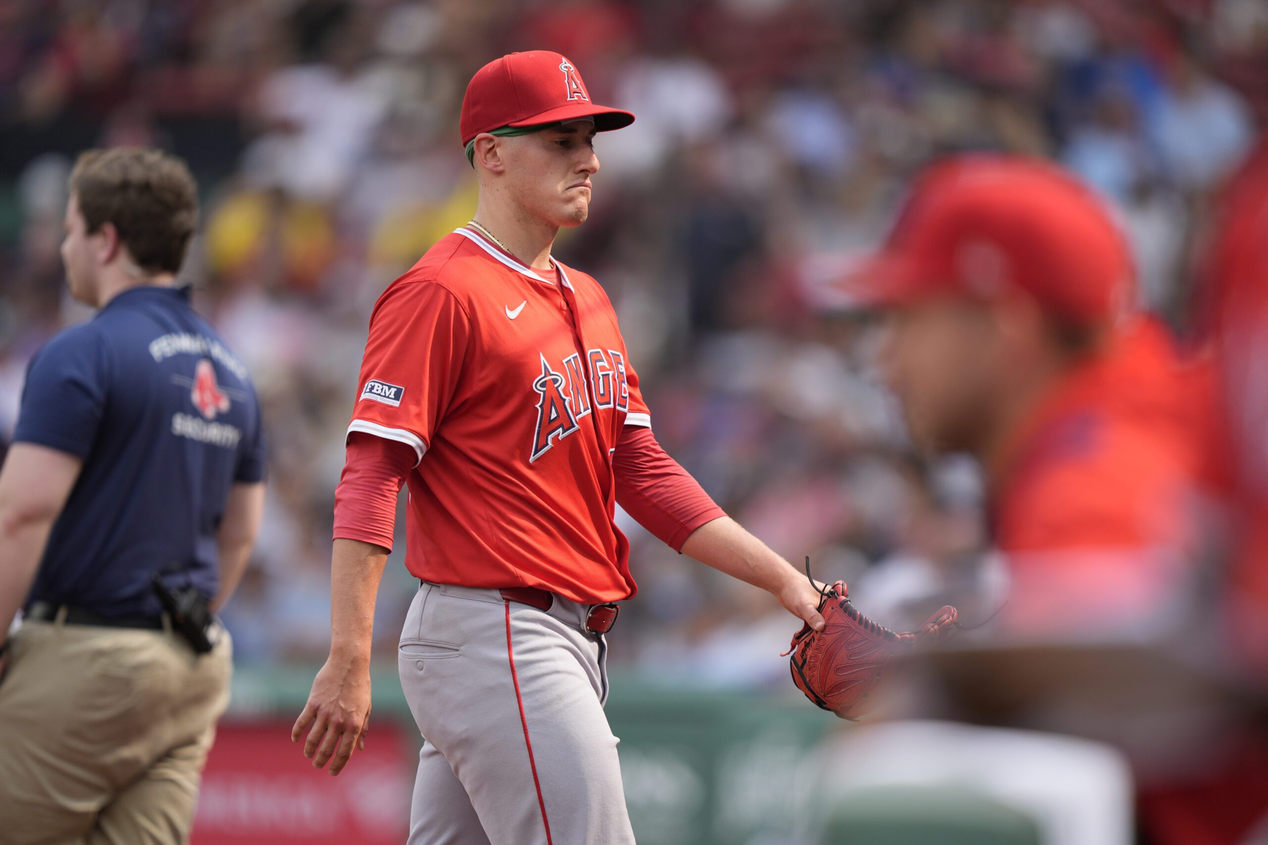 Photo: Sam Aldegheri walks to the dugout after being pulled in the eight inning of a baseball game against the Boston Red Sox, Wednesday, June 4, 2025, in Boston. (AP Photo/Robert F. Bukaty)