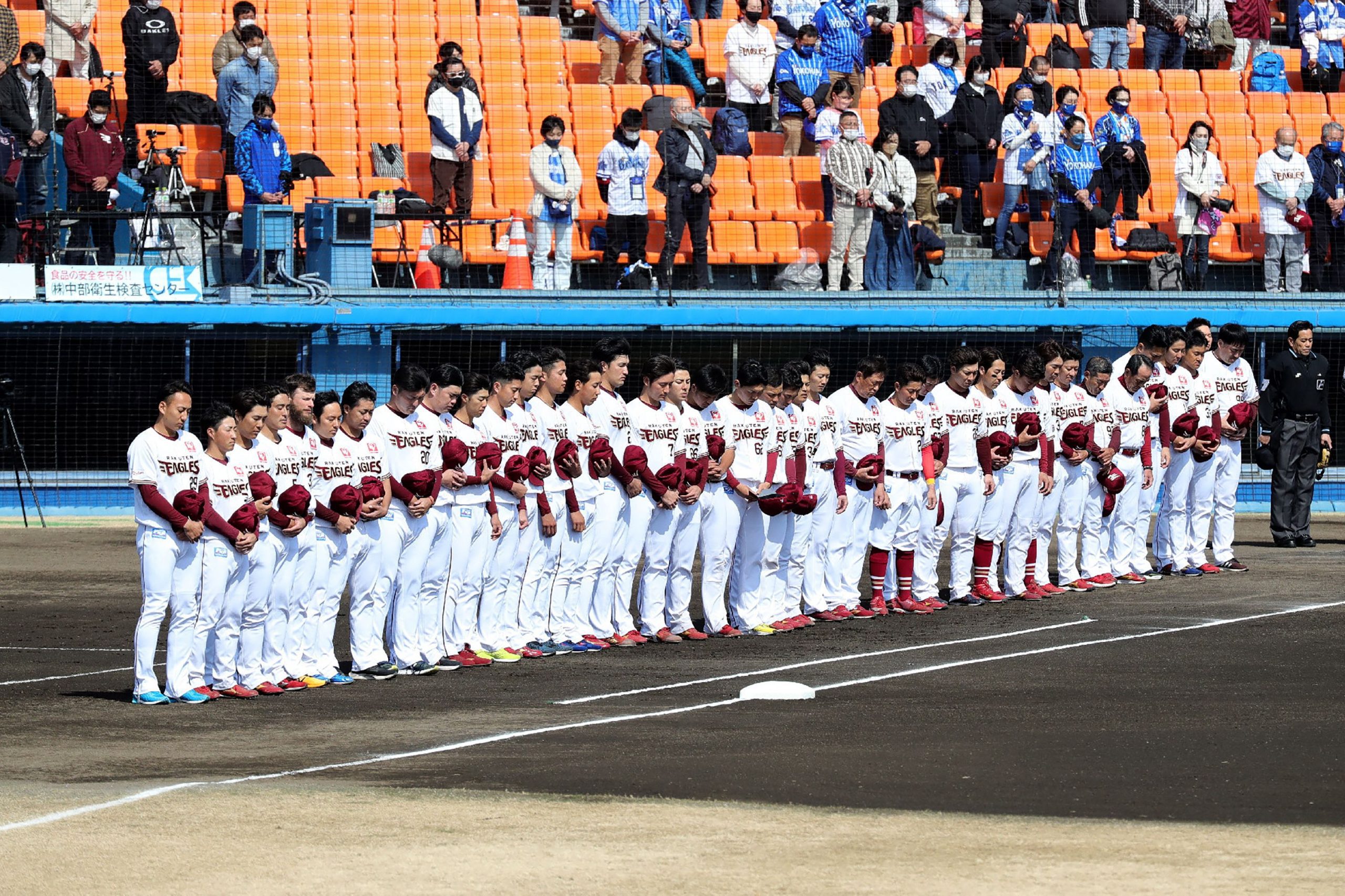 Photo Credit: Players of Rakuten Golden Eagles and spectators pay their respects to the victims of the 2011 Great East Japan earthquake and tsunami, ahead of their Nippon Professional Baseball league game. (Photo by JIJI PRESS / AFP) / Japan OUT (Photo by STR/JIJI PRESS/AFP via Getty Images)