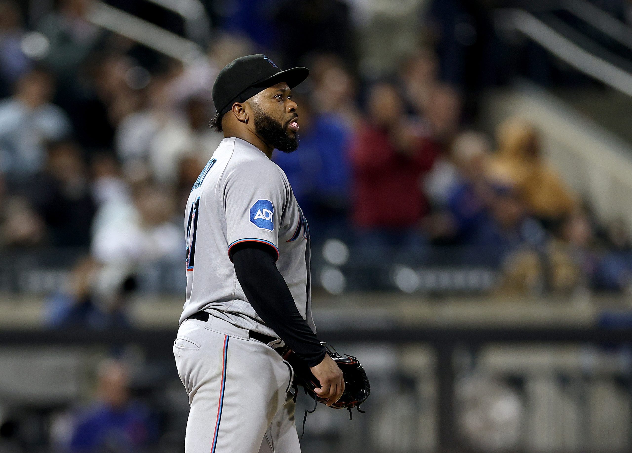Photo Credit: Johnny Cueto #47 of the Miami Marlins reacts after giving up a home run in the second inning against the New York Mets. (Photo by Elsa/Getty Images)