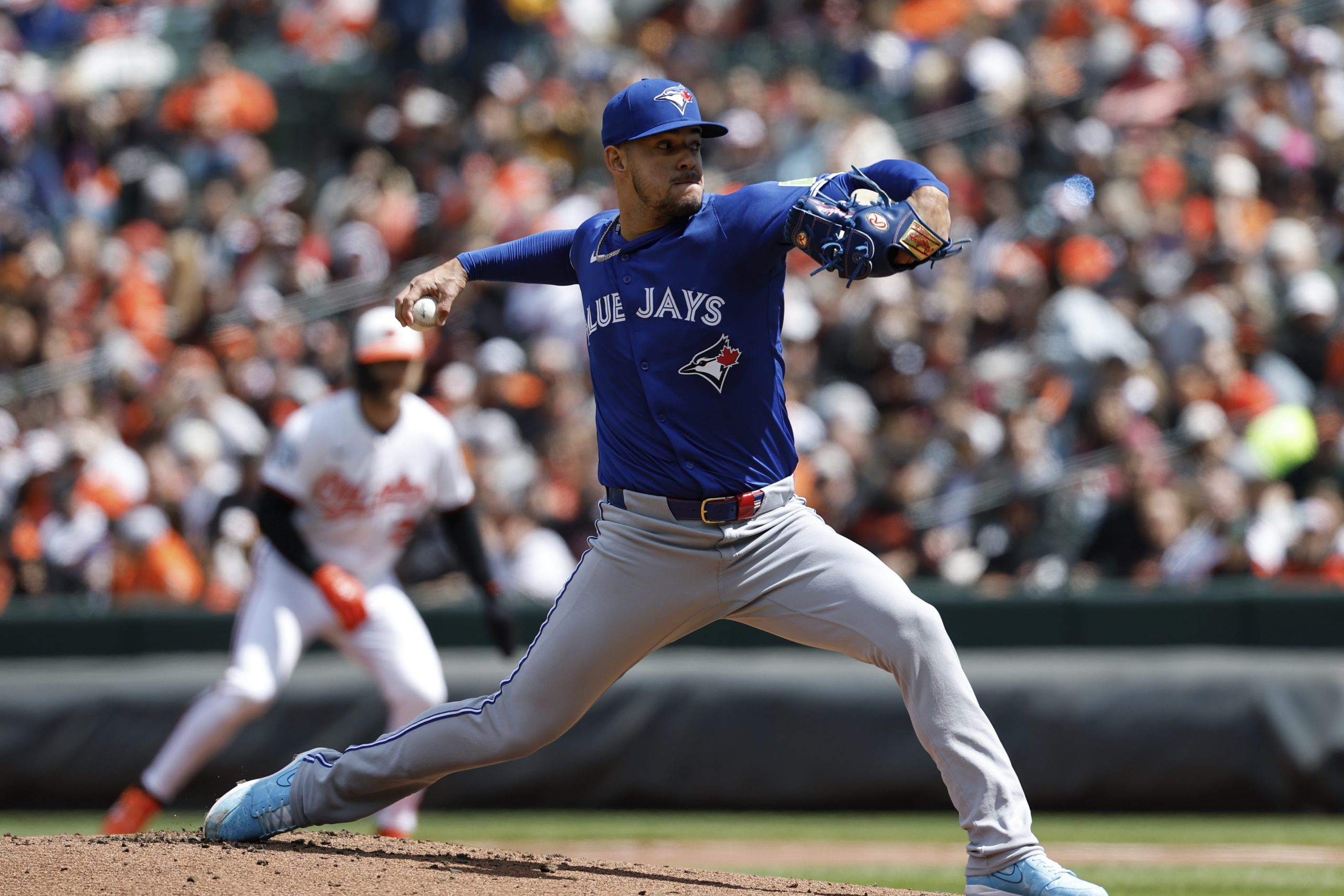 Photo: Toronto Blue Jays pitcher José Berríos throws during the first inning of a baseball game against the Baltimore Orioles in Baltimore, Sunday, April 13, 2025. (AP Photo/Terrance Williams)