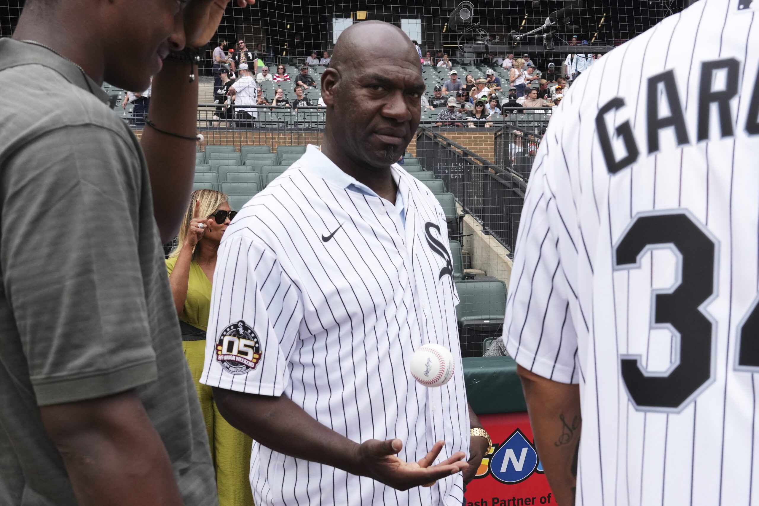 Photo: Chicago White Sox 2005 World Series Championship starting pitcher Jose Contreras warms up as he prepares to throw a ceremonial first pitch before a baseball game between the Cleveland Guardians and the Chicago White Sox in Chicago, Sunday, July 13, 2025. (AP Photo/Nam Y. Huh)