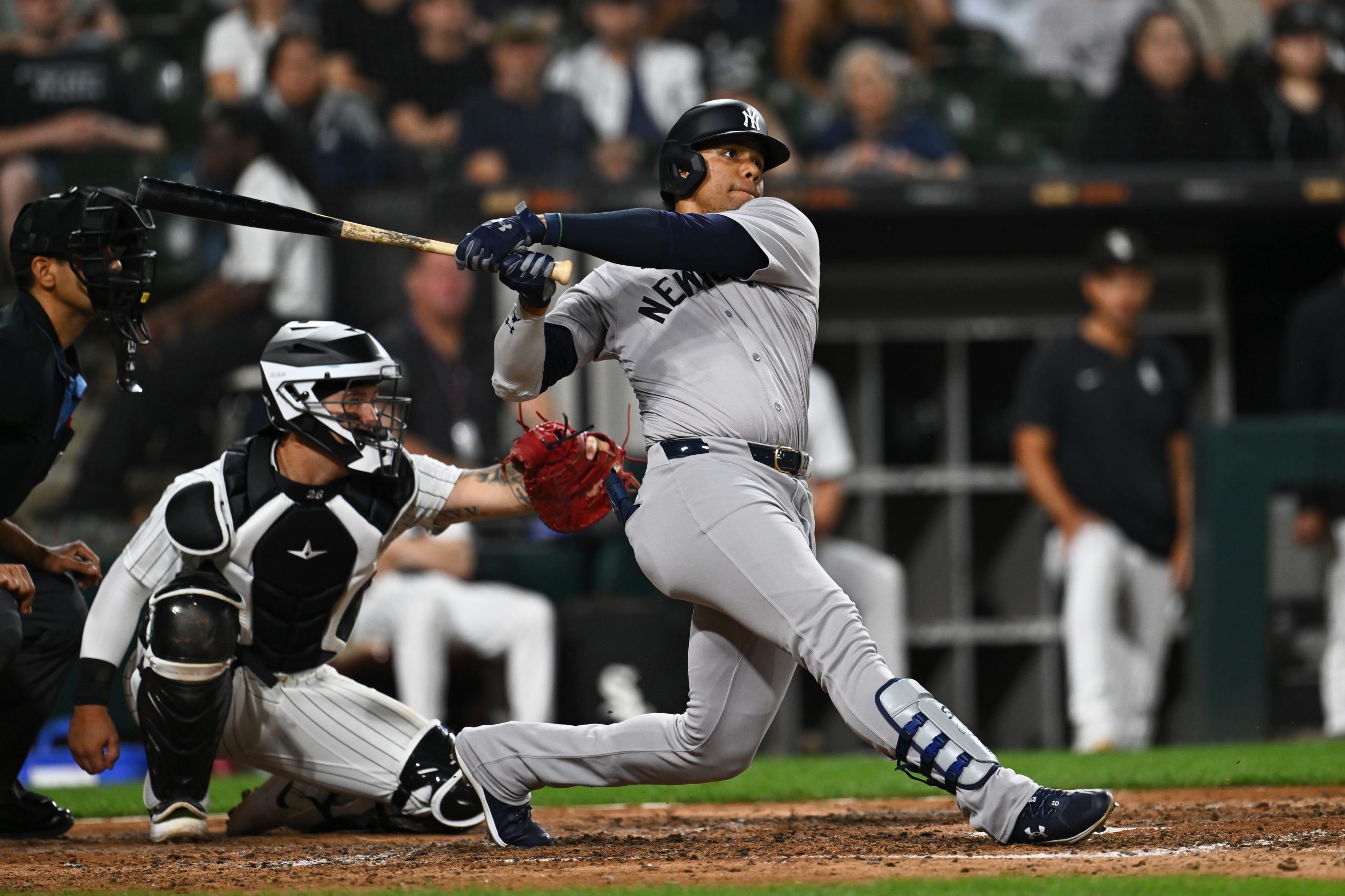 Photo Credit: Juan Soto #22 of the New York Yankees hits a solo home run in the seventh inning against the Chicago White Sox at Guaranteed Rate Field on August 13, 2024 in Chicago, Illinois. (Photo by Quinn Harris/Getty Images)