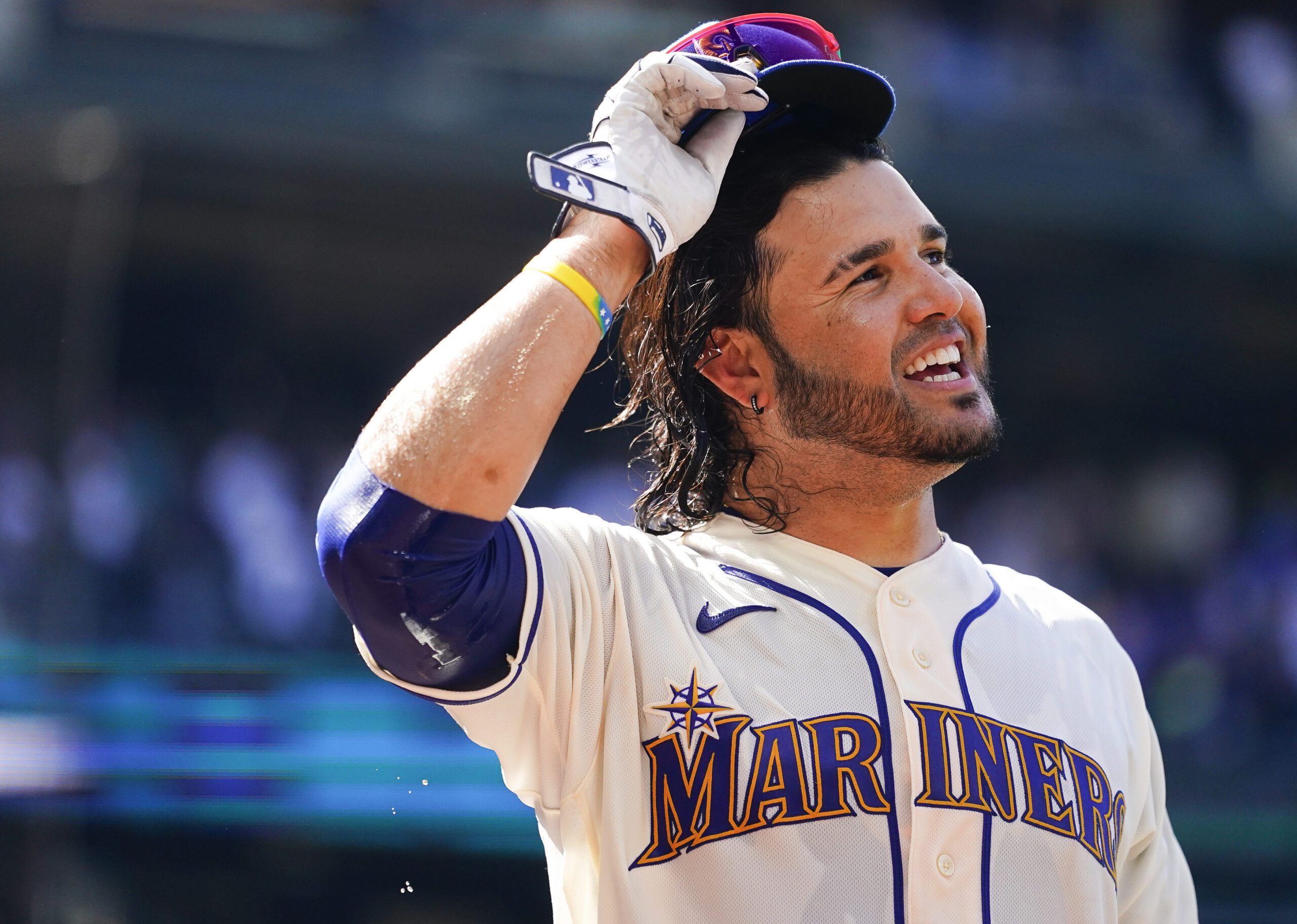 Photo: Seattle Mariners’ Eugenio Suarez is interviewed after hitting a walk-off home run to win the game against the Pittsburgh Pirates in a baseball game Sunday, May 28, 2023, in Seattle. (AP Photo/Lindsey Wasson)