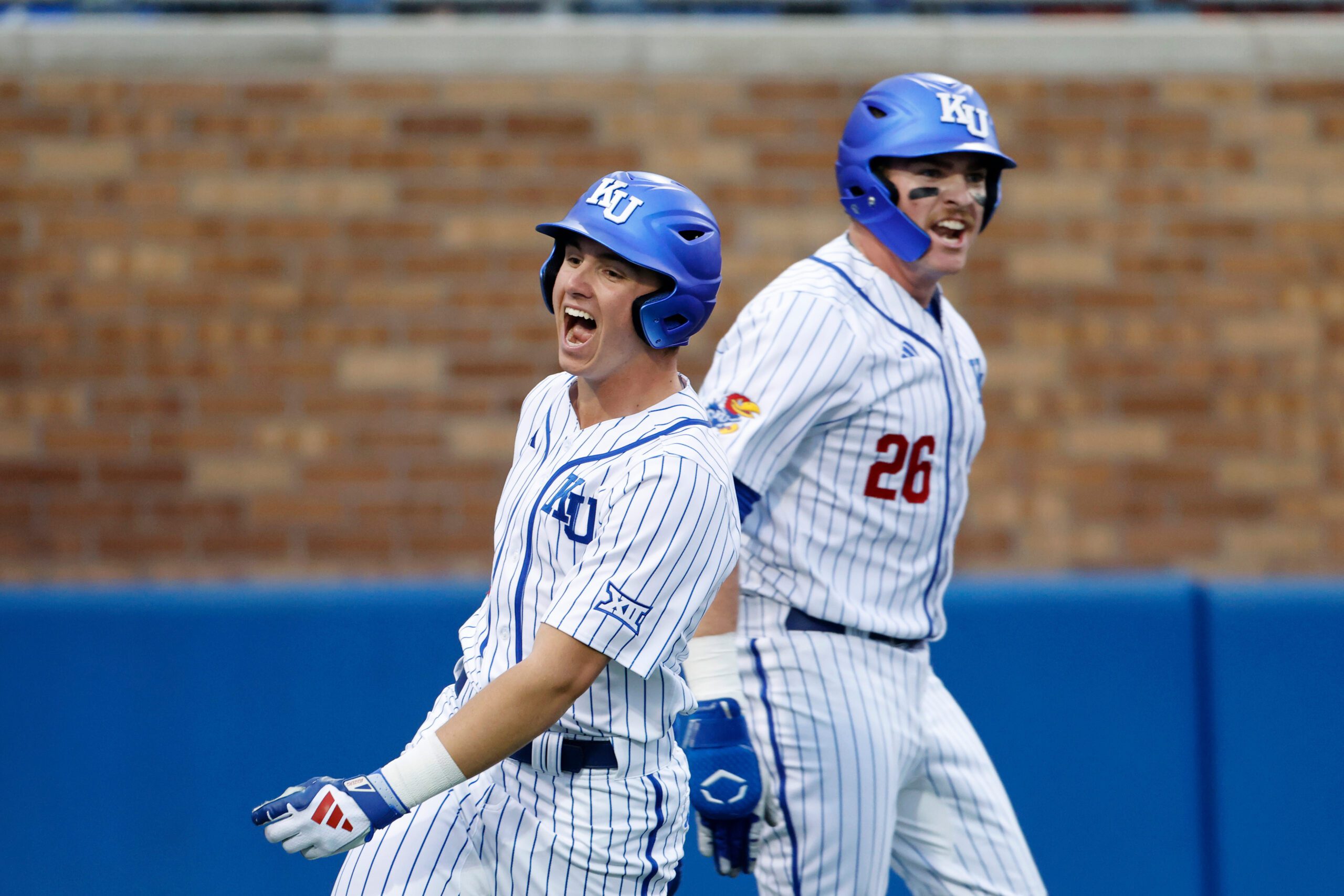 PHOTO: Kansas’ Tyson LeBlanc, left, and Brady Ballinger (26) react after scoring off a Dariel Osoria single during eighth inning of an NCAA college baseball game against St. Thomas on Thursday, March 5, 2026, in Lawrence, Kan. (AP Photo/Colin E. Braley)
