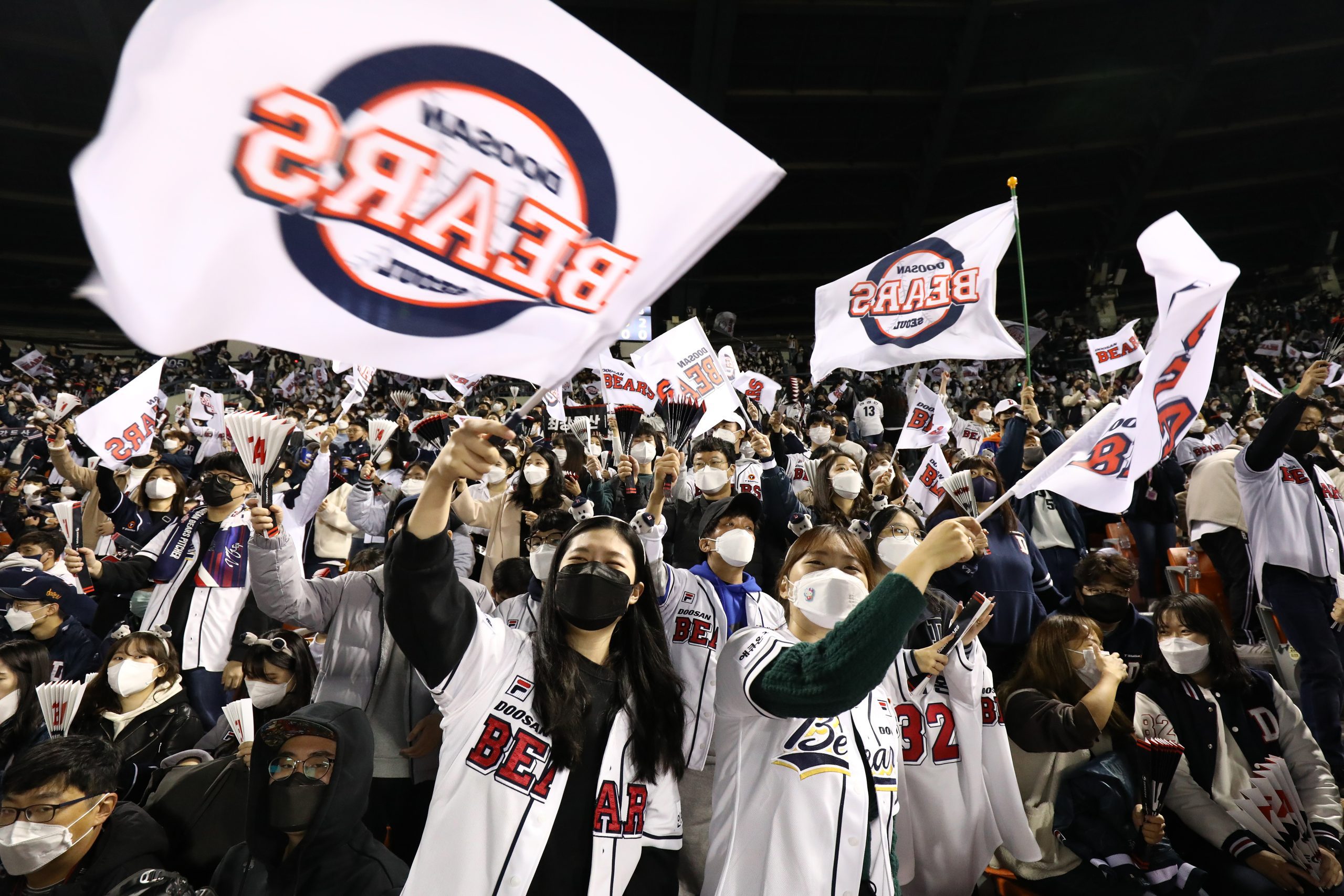 Photo Credit: Baseball fans during the KBO postseason between Kiwoom Heroes and Doosan Bears at the Jamsil Stadium on November 01, 2021 in Seoul, South Korea. (Photo by Chung Sung-Jun/Getty Images)