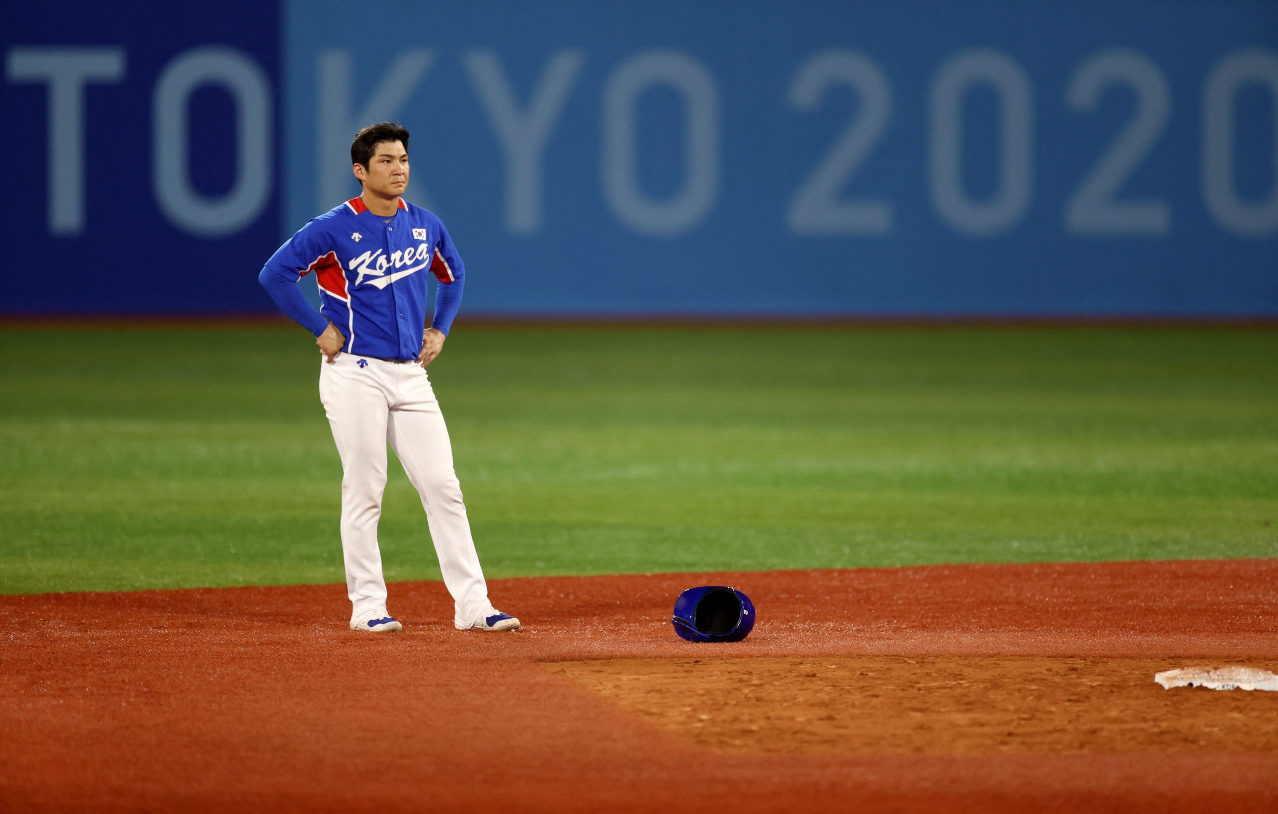 Photo Credit: South Korea’s Oh Ji-hwan stands near second base. (Photo by KAZUHIRO FUJIHARA / AFP) (Photo by KAZUHIRO FUJIHARA/AFP via Getty Images)