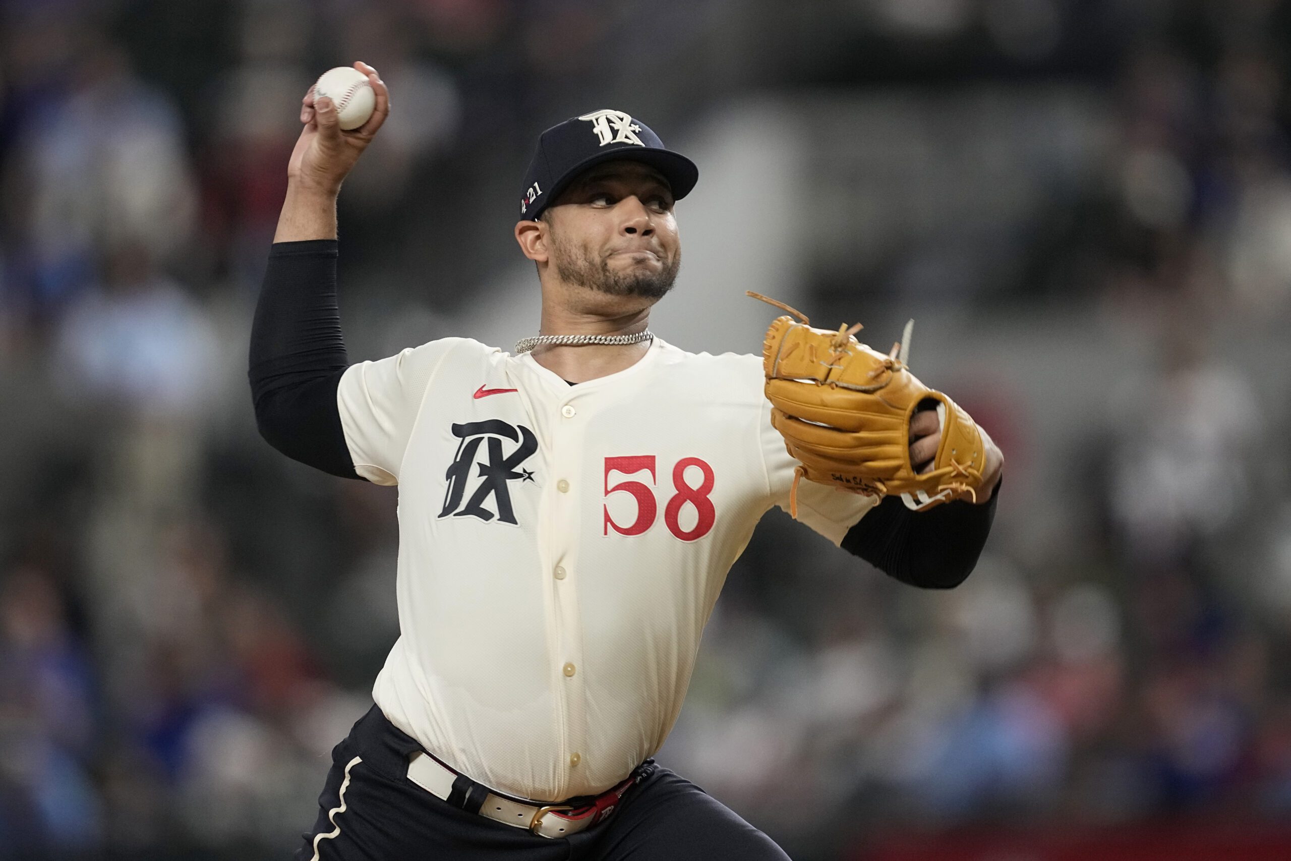 Photo: Texas Rangers starting pitcher Gerson Garabito throws in the first inning of a baseball game against the Los Angeles Angels, Friday, Sept. 6, 2024, in Arlington, Texas. (AP Photo/Tony Gutierrez)
