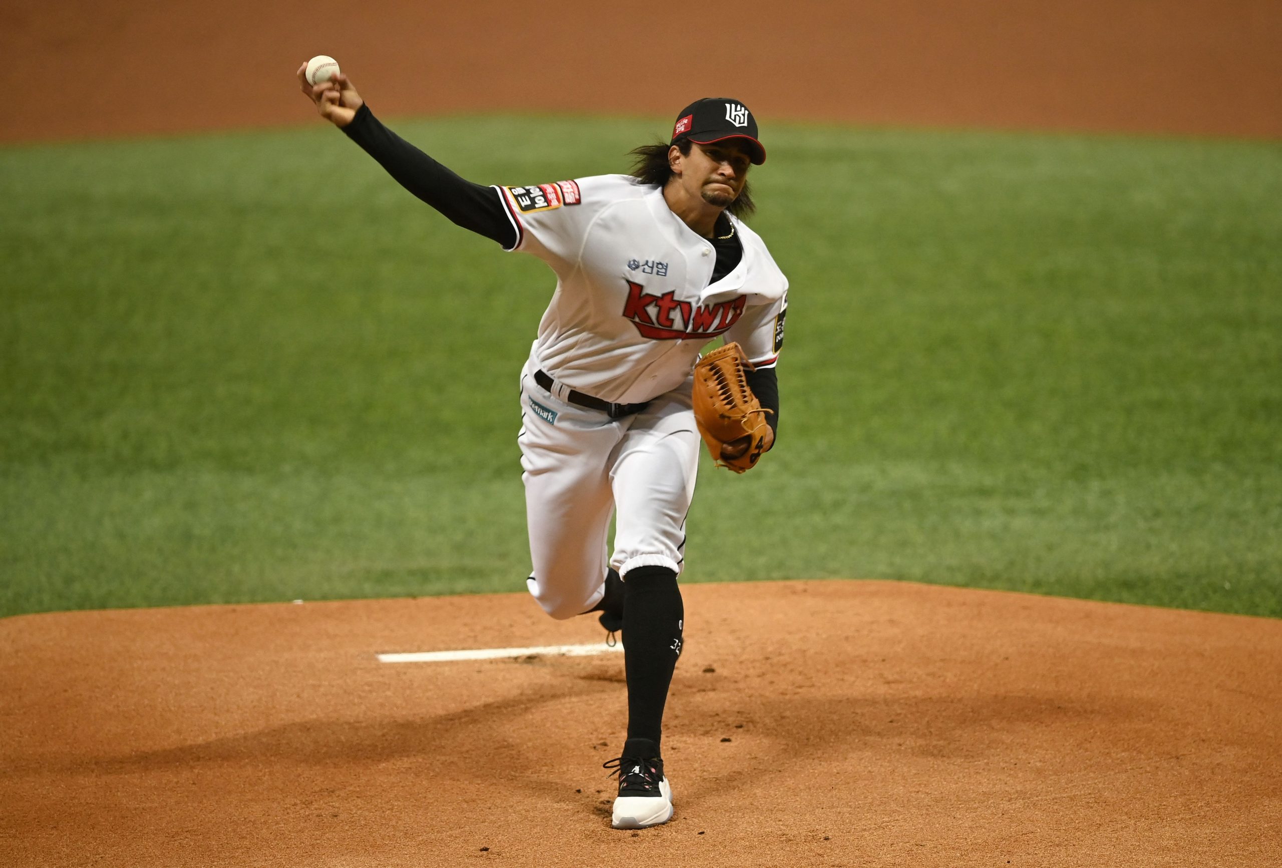 Photo Credit: William Cuevas of KT Wiz pitches in the first inning during the first baseball game of the Korean Series between Doosan Bears and KT Wiz at Gocheok Skydome in Seoul on November 14, 2021. (Photo by Jung Yeon-je / AFP) (Photo by JUNG YEON-JE/AFP via Getty Images)