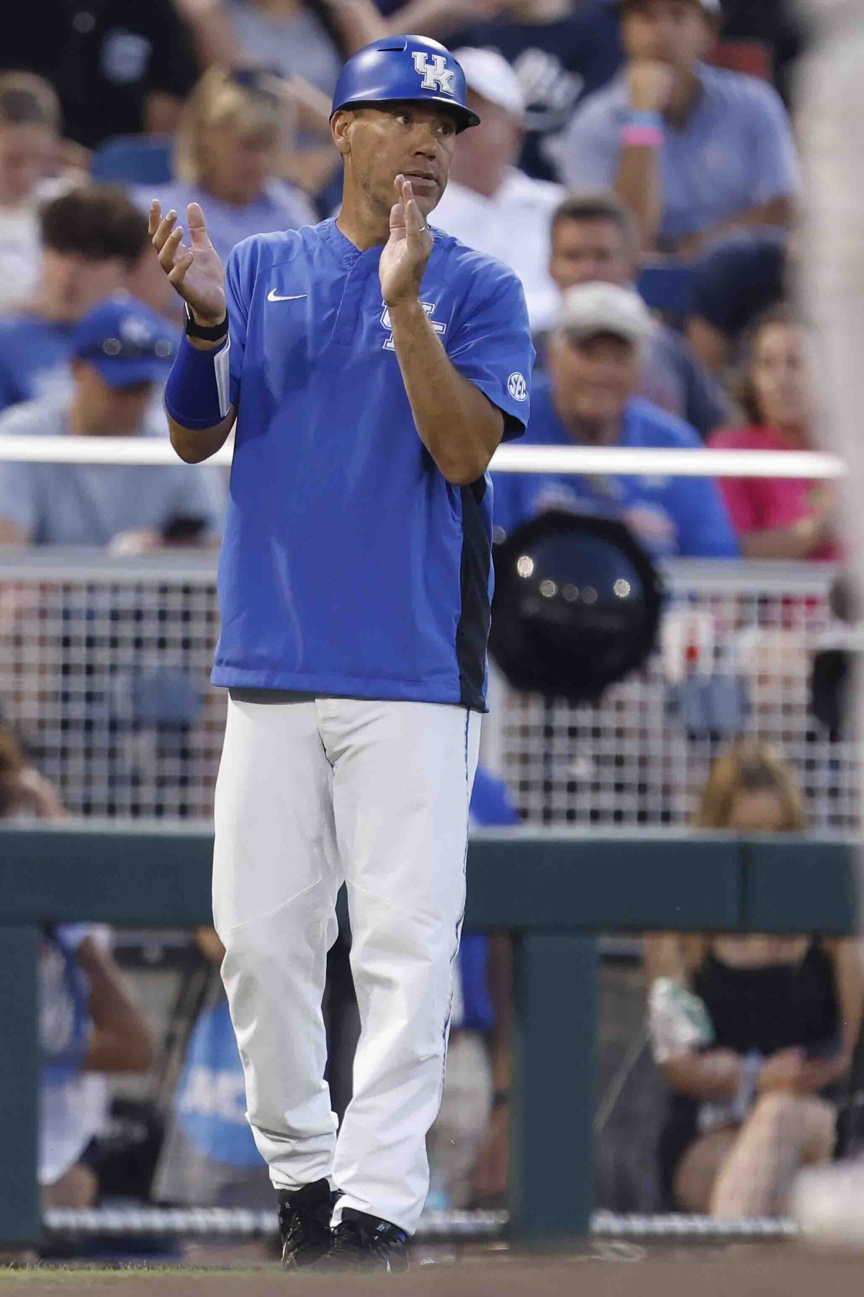 PHOTO: Kentucky head coach Nick Mingione pictured during an NCAA College World Series baseball game against Texas A&M on Monday, June 17, 2024, in Omaha, Neb. Texas A&M won 5-1. (AP Photo/Mike Buscher)