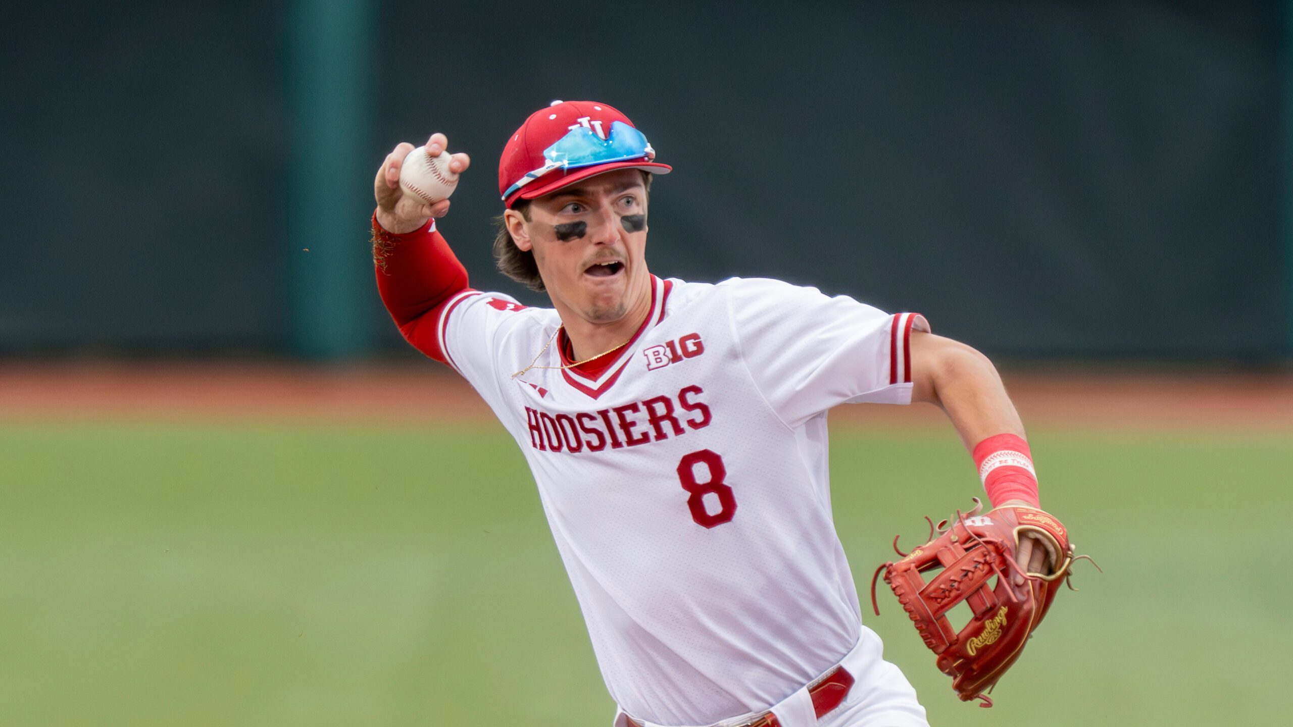 PHOTO: Indiana infielder Tyler Cerny (8) during an NCAA baseball game on Tuesday, March 4, 2024, in Bloomington, Ind. (AP Photo/Doug McSchooler)