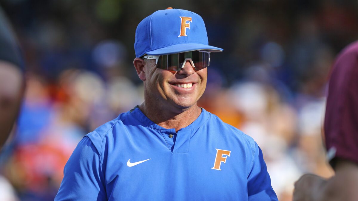 PHOTO: Florida head coach Kevin O’Sullivan before an NCAA regional championship baseball game against Central Michigan on Friday, June 3, 2022 in Gainesville, Fla. (AP Photo/Gary McCullough)