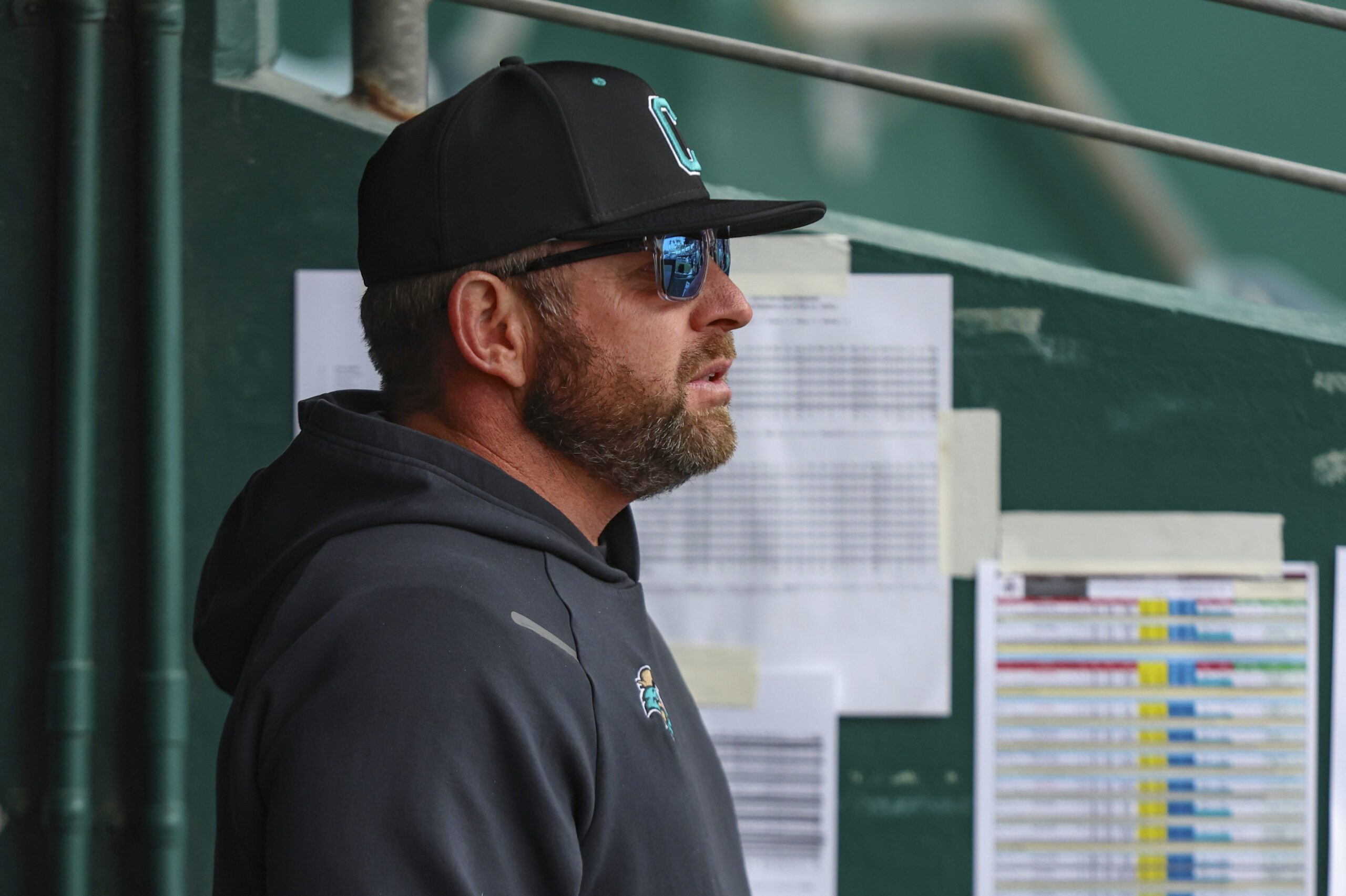PHOTO: Coastal Carolina head coach Kevin Schnall watches play during an NCAA baseball game against Ohio State in Jacksonville, Fla., Saturday, Feb. 22, 2025. (AP Photo/Gary McCullough)